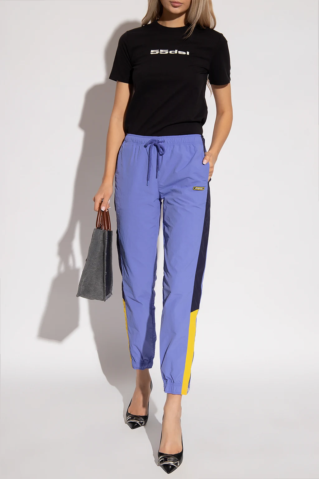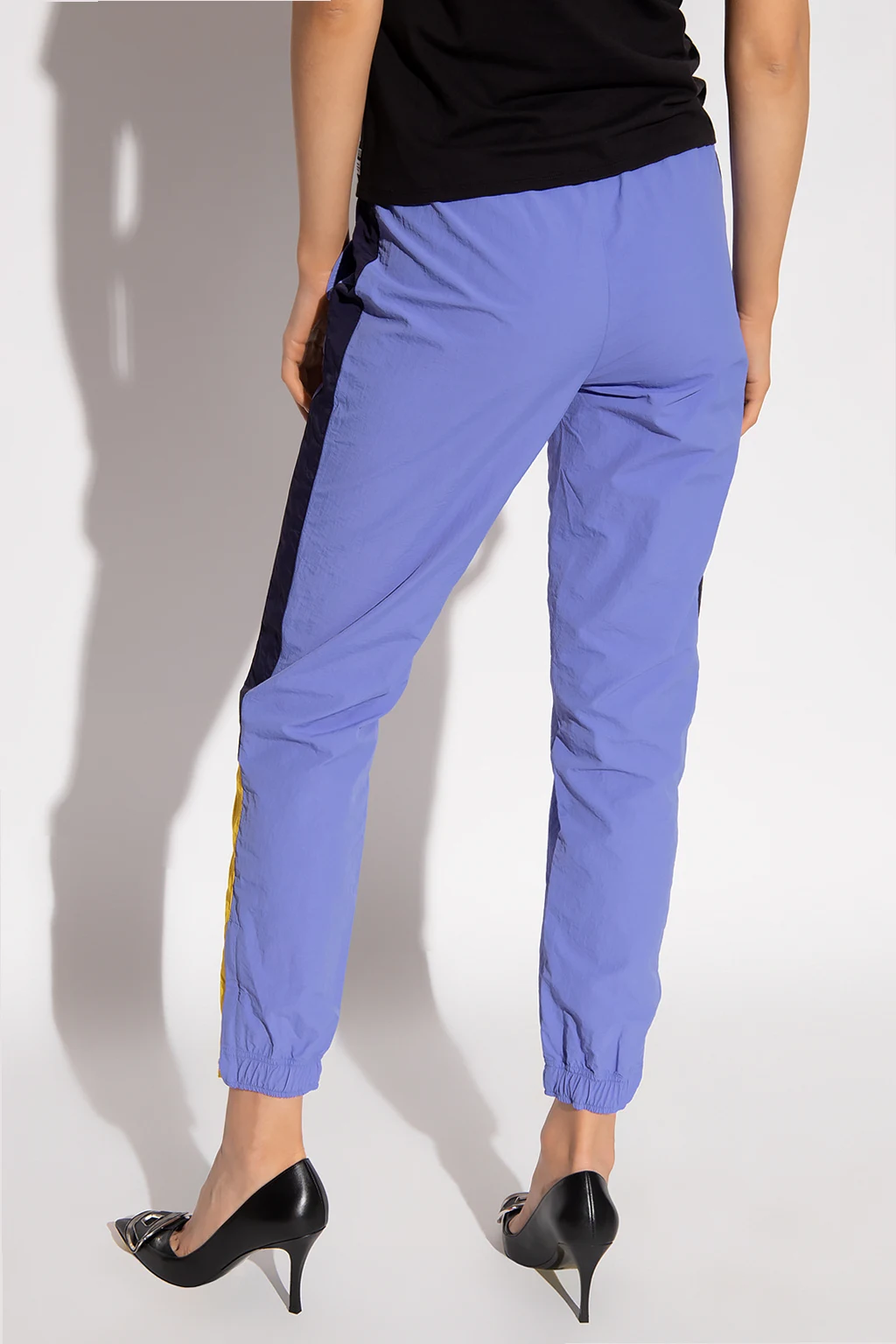 Blueish purple 'AWWB-SWEANG-HT25' track pants from Diesel, the 'Sport 55DSL' collection. Accentuated with yellow and navy blue side panels, this pair features a drawstring waistband, logo patches on the front and back, two slip pockets and elasticated cuffs with zip vents.