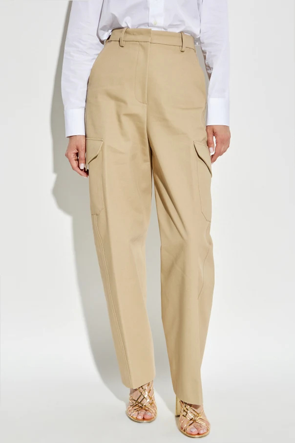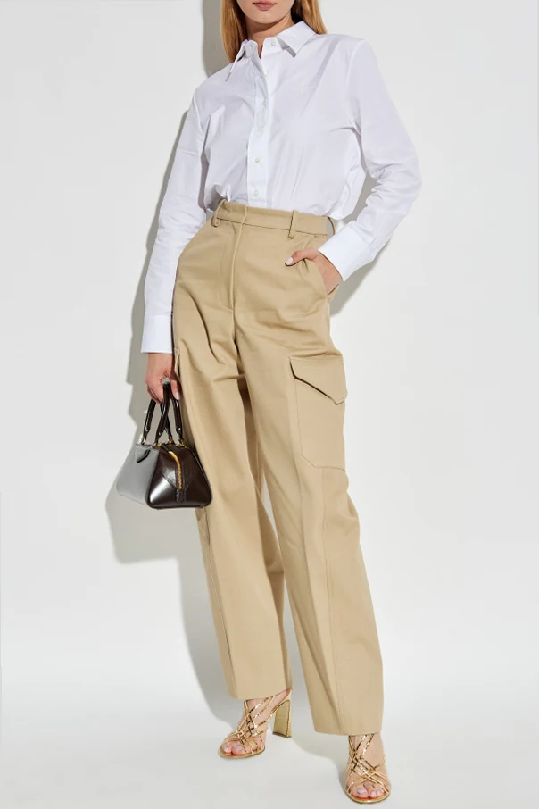 Discover the unparalleled sophistication of these beige women's cargo trousers by Givenchy . Expertly crafted from a refined blend of cotton and wool, the smooth, structured fabric offers a seamless harmony of comfort and elevated style. With their gently relaxed, straight silhouette and tapered legs, these trousers deliver a modern take on classic utility. The high waistline subtly elongates the silhouette, while the iconic dual flap pockets at the thighs infuse a touch of contemporary flair. The understated, monochromatic design ensures versatility, making these trousers an exceptional foundation for any discerning wardrobe. Finished with a concealed zip fly and classic button closure, this piece epitomizes effortless sophistication. Why choose this product? Exquisite cotton-wool blend for lasting comfort and elegance Signature cargo pockets elevate the utilitarian aesthetic High waist design flatters and elongates the legs Conceived by renowned fashion house Givenchy Versatile beige hue suitable for countless ensembles