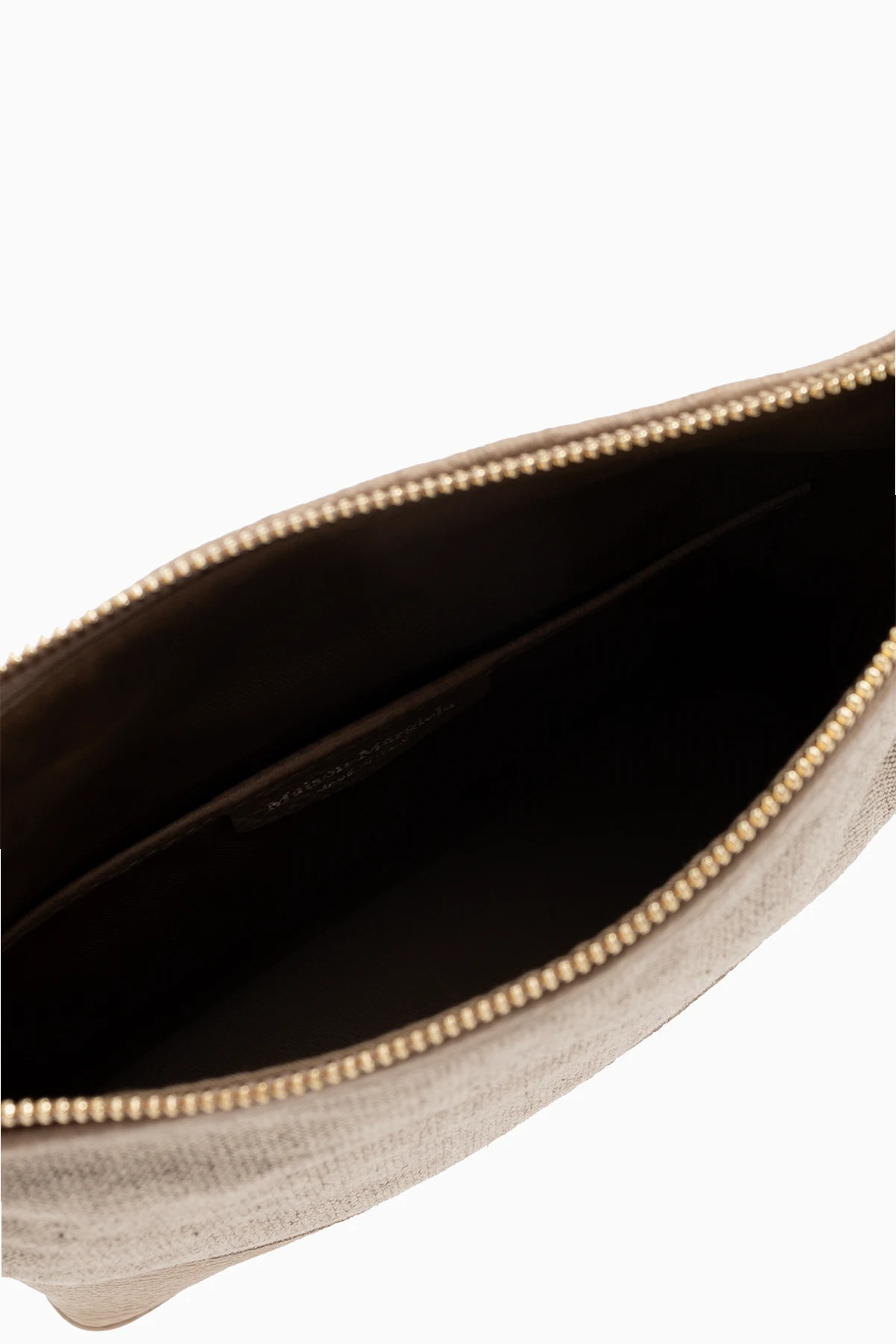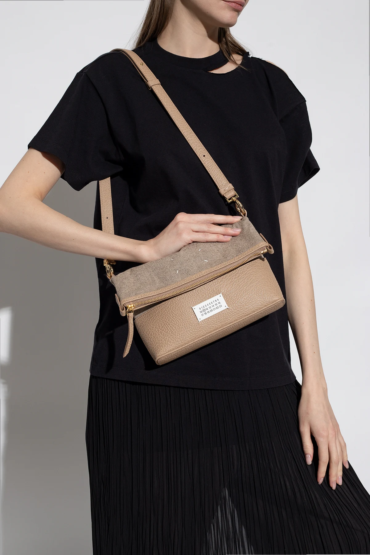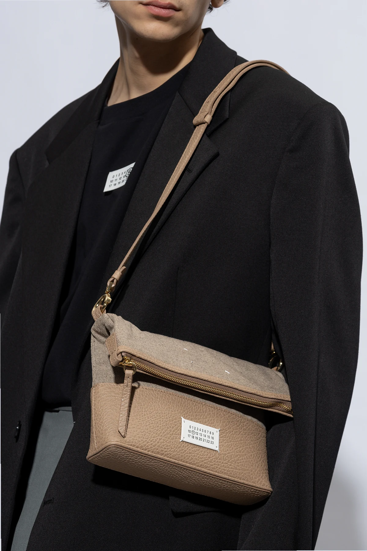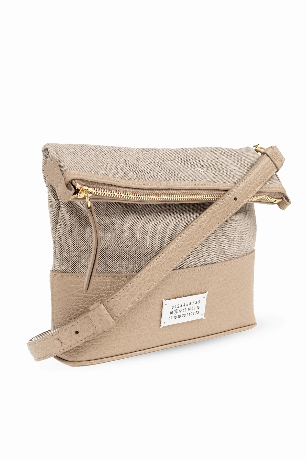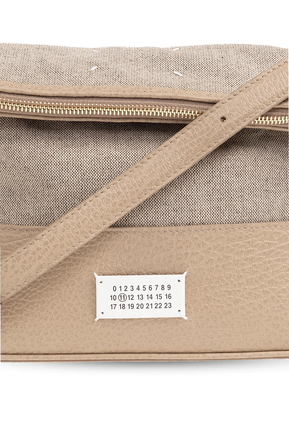Beige and grey shoulder bag from Maison Margiela. Made of fabric and trimmed with leather, this design fastens via a zip and showcases a signature white logo patch, a detachable and adjustable shoulder strap, gold-tone metal hardware and one internal compartment with a slip pocket.