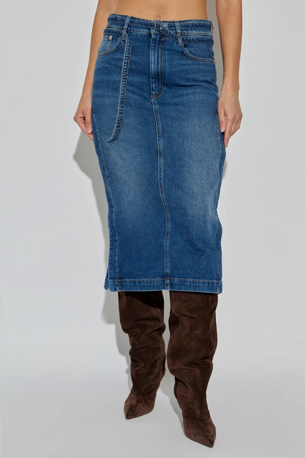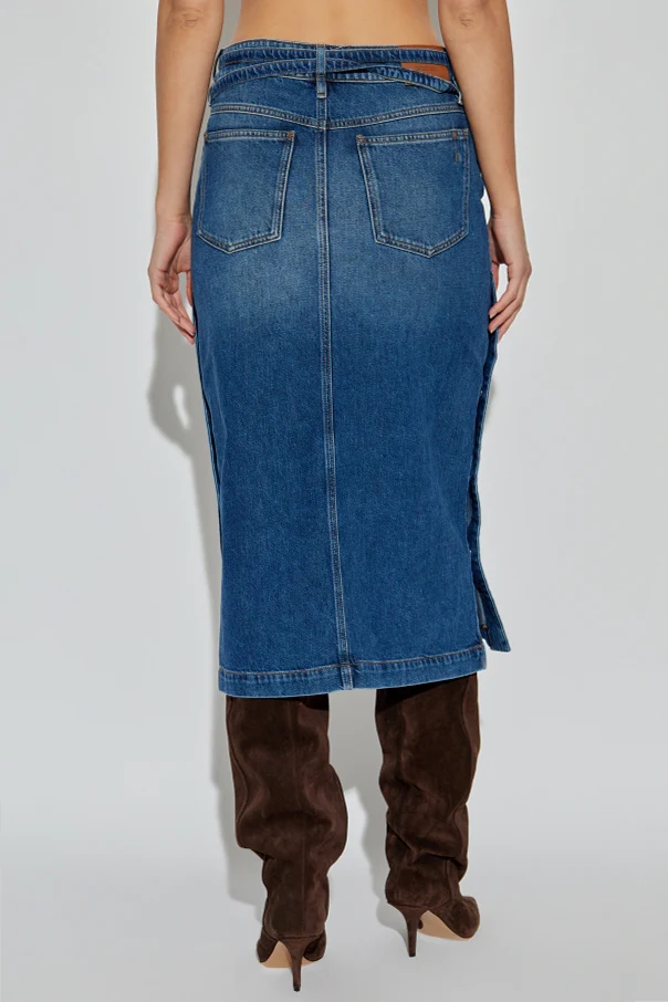 Introducing the Biblio Denim Midi Skirt by SPORTMAX —a quintessential statement in refined luxury and contemporary tailoring. Crafted from premium, deep navy denim with a classic weave and a subtle front fade, this streamlined pencil silhouette elegantly contours the figure. Signature yellow double stitching, tailored front seams, and a distinguished central back seam underscore the skirt’s artisanal craftsmanship. The tailored belt, seamlessly integrated from the same exquisite material, accentuates the waist, while four classic pockets offer both practicality and style. Distinctive deep side slits ensure freedom of movement and add a sophisticated edge. Completing the look, a genuine leather patch debossed with the SPORTMAX logo attests to its authenticity and exclusive heritage. Why choose this product? Meticulously tailored from high-grade cotton denim Elegant midi length with pencil silhouette Unique SPORTMAX leather branding for authenticity Functional front and back pockets Thoughtful deep side slits for comfort and sophistication