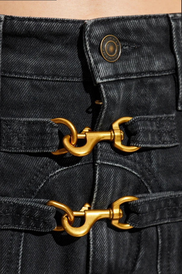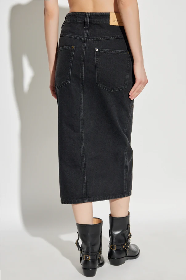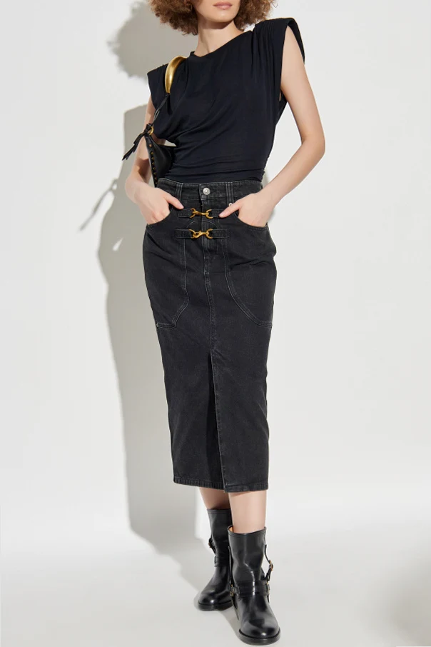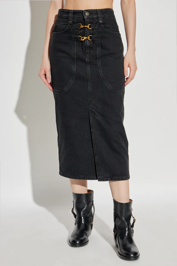 The Pavina Denim Skirt by Isabel Marant effortlessly fuses Parisian sophistication with contemporary utility. Artfully tailored in structured black denim, this mid-length skirt elegantly skims below the knees, while the high-rise silhouette and wide waistband create a striking, flattering form. Distinctive contrasting stitching accentuates the pure lines and classic denim heritage, offering a refined yet subtly bold aesthetic. The front features two elongated, eye-catching pockets and vertical gold-tone metal carabiner closures —a unique embellishment that echoes equestrian and utility influences. Finished with two traditional back pockets, every detail alludes to Marant’s hallmark of timeless, effortless chic. Crafted exclusively from the finest cotton denim, the Pavina Skirt offers both structure and enduring comfort. Why Choose This Product? Exquisite tailoring and distinctive utility-inspired detailing Luxurious, resilient 100% cotton denim Signature design by Isabel Marant, renowned for elevated casual elegance Versatile mid-length cut, ideal for sophisticated day-to-evening styling