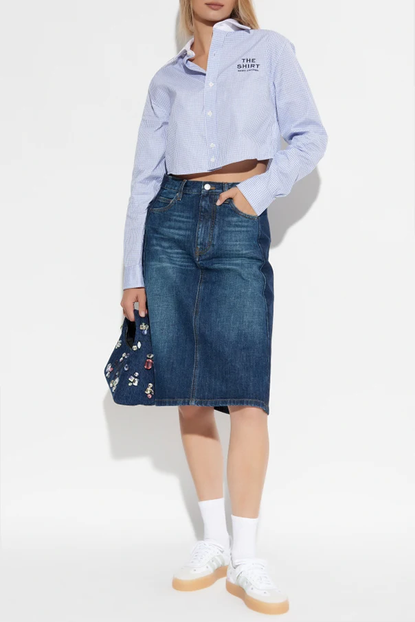 Discover the epitome of urban elegance with this mid-length denim skirt by Marc Jacobs. Impeccably tailored in a timeless A-line silhouette, it gracefully falls below the knee, balancing classic femininity with contemporary flair. The skirt’s deep navy hue is enhanced by delicate front and side shadowing, adding rich dimension to the premium, robust denim. Distinguished by bold, contrasting topstitching in a warm yellow-brown and signature, sculpted back pockets—one adorned with a striking geometric “M”—this piece embodies thoughtful artistry. A luxe leather patch featuring the designer's embossed logo subtly elevates the exclusive appeal. Crafted from exquisite cotton denim, this skirt ensures both long-lasting durability and exceptional comfort for sophisticated daily wear. Why choose this product? Original Marc Jacobs craftsmanship and iconic detailing Flattering, versatile A-line midi design Rich, deep color and unique stitched accents Luxurious and durable premium denim Elevated by distinctive branded touches