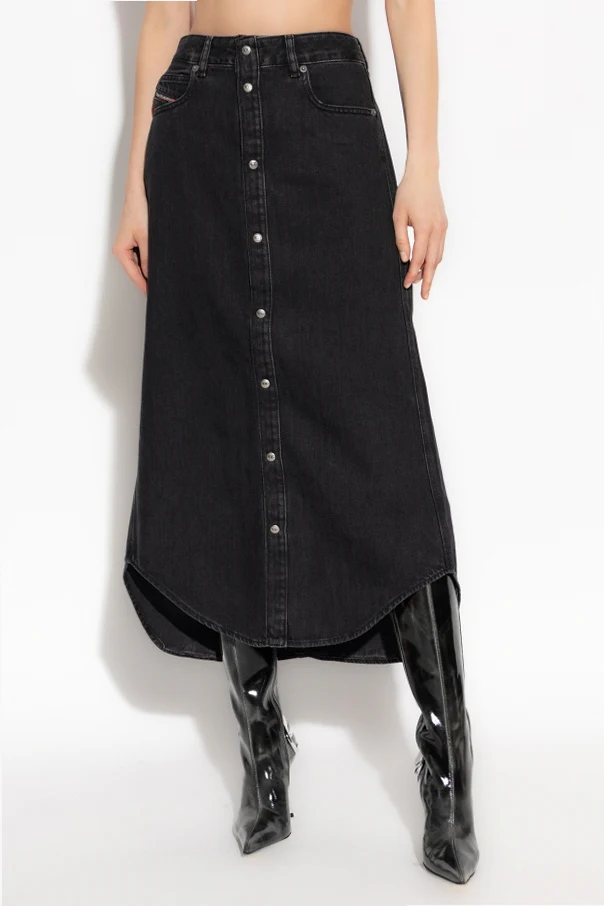 Experience understated sophistication with the DE-ARD-LONG midi denim skirt by Diesel. This refined silhouette features a gently flared, softly rounded hem with subtle elongated sides, expertly sculpting the waist with its high-rise fit. Meticulously crafted from resilient, premium black denim with a delicately faded finish, this skirt exudes both structure and comfort through an exceptional blend of cotton and lyocell. Distinctive yet minimal, the design is accentuated by pronounced stitching and a row of elegant metal buttons gracing the entire front. Traditional front and back pockets, classic five belt loops, and the signature “Diesel Industry Denim Division” patch on the back waistband in cream, blue, and red, add a unique touch of heritage. Effortlessly versatile, this piece is a testament to Diesel's legacy of iconic, impeccably made denim. Why choose this product? Masterfully tailored for a flattering, feminine shape Premium denim fabric ensures lasting quality and comfort Refined details—metal buttons and signature branding—set it apart Exemplifies Diesel’s heritage of bold yet timeless design