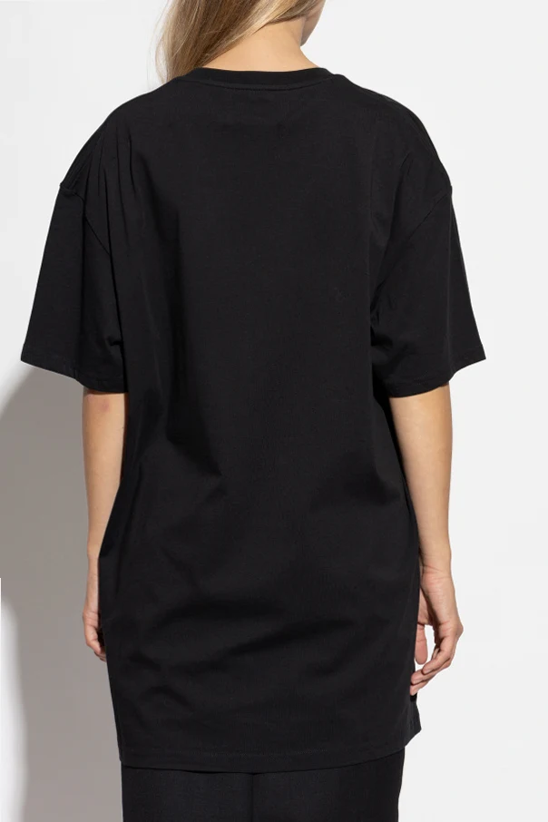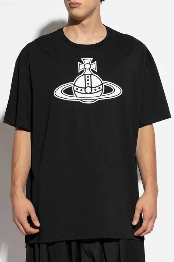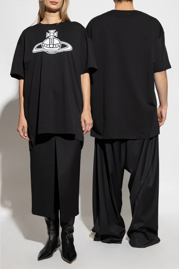 Revel in the expressive spirit of high fashion with this oversize T-shirt by Vivienne Westwood . Meticulously crafted from sumptuous organic cotton, this garment features a distinctly loose silhouette with generously dropped shoulders and a hemline extending gracefully below the hips. A bold, oversized white designer emblem—a crowned planet with rings—adorns the chest, lending unmistakable character and exclusivity. The deep black hue, refined crew neckline, and precise finishing at the sleeves and hem result in an elevated sense of sophistication. This T-shirt seamlessly fuses avant-garde heritage with modern versatility, embodying Westwood’s legacy of defiant elegance and rebellious artistry. Why choose this product? Exclusive oversize silhouette by renowned designer Vivienne Westwood Luxurious, resilient organic cotton for comfort and longevity Striking signature print for a bold, instantly recognizable look Expert craftsmanship with meticulous attention to detail Timeless black color—versatile for sophisticated wardrobes