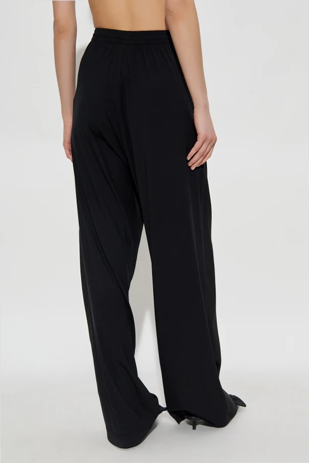 The wide, elasticized waistband ensures a flattering, comfortable fit, adapting elegantly to the shape of your waist. Thoughtfully finished with discreet side pockets and a delicately embroidered designer logo near the pocket, these pants embody meticulous attention to detail and understated opulence.