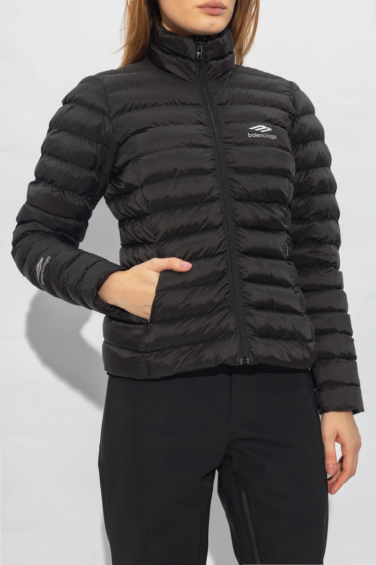 Black quilted ski jacket from Balenciaga, the ‘Skiwear’ collecton. Made from light matte nylon with 280 gsm lightweight padded technical lining, this garment features a zip fastening, reflective 3B sports icon artwork printed at front and on one cuff, high stand up collar, two zip pockets and long sleeves with ribbed cuffs.