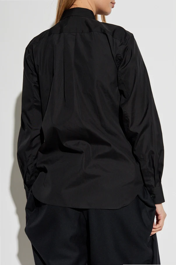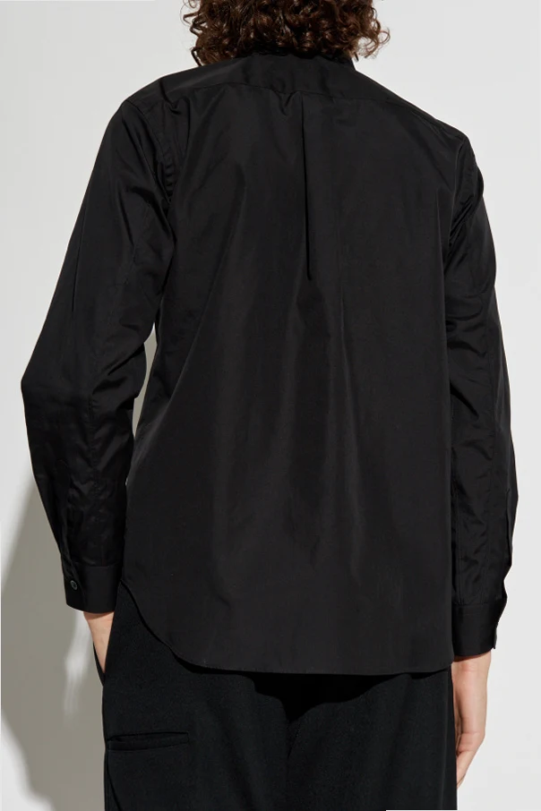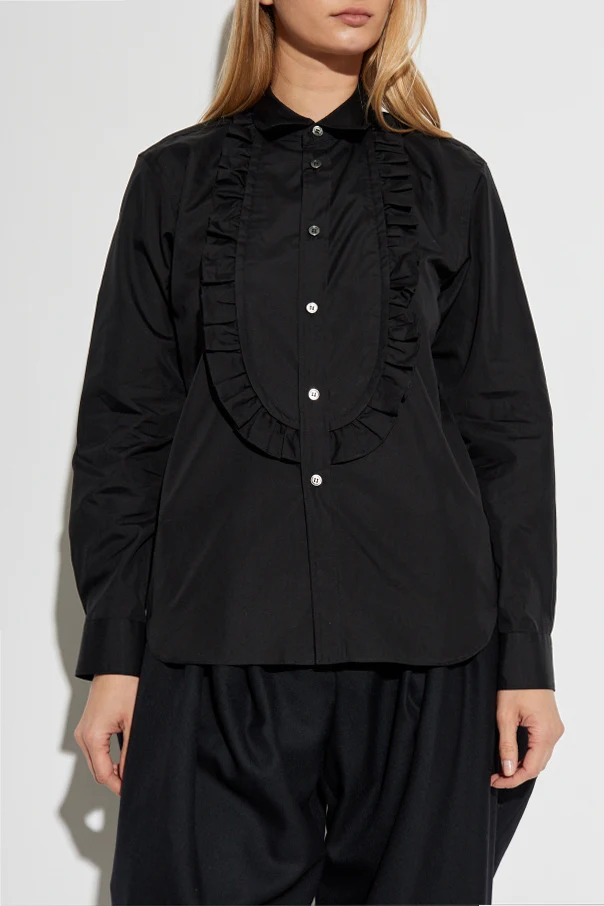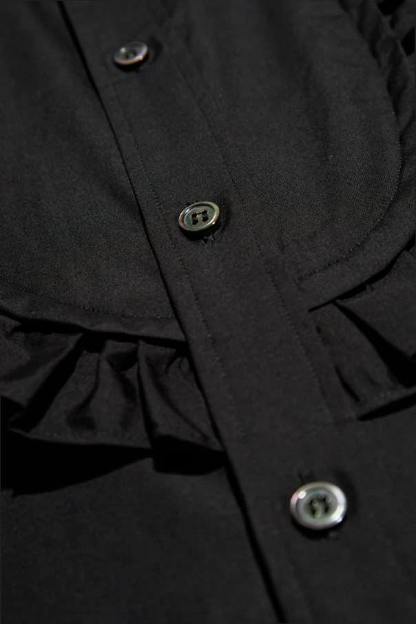 The Comme des Garçons Black Ruffled Front Shirt epitomizes timeless sophistication with a modern twist. Exquisitely crafted from smooth, lustrous cotton, this unisex shirt features a classic silhouette with long sleeves and a structured collar, all anchored by a traditional hip-length cut with a subtly elongated, rounded back hem. The front is adorned with a striking, oval-shaped ruffled bib—meticulously gathered and artfully placed for a distinguished, decorative statement. Contrasting, visible buttons punctuate the deep black fabric, reflecting the brand’s affinity for thoughtful detail and avant-garde aesthetics. Reimagined through the legendary vision of Comme des Garçons Black , in collaboration with Nike, this piece harmoniously fuses luxurious material with contemporary design, resulting in a shirt that elevates every wardrobe. Why choose this product? Exclusive, limited-edition designer collaboration Premium, gently glossy cotton fabric Dramatic ruffled front bib for unique sophistication Contrasting buttons for modern visual intrigue Unisex design, exquisitely tailored for versatility