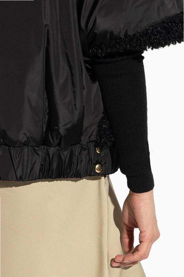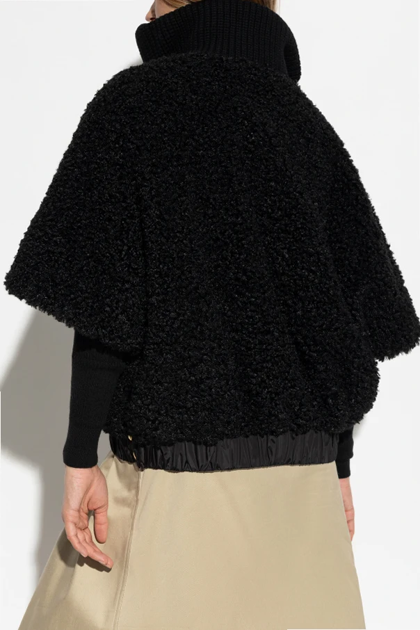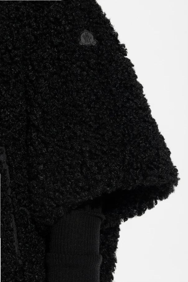 Experience the sophisticated versatility of this reversible poncho by Moncler , an exquisite statement piece for contemporary wardrobes. Defined by its oversized, boxy silhouette, this striking cape features wide, elbow-length sleeves and a cropped shape that elegantly skims the hips. An adjustable drawstring hem adds a refined, customizable finish. Crafted from innovative materials, one side boasts a plush faux fur effect with a textured boucle structure, reminiscent of genuine shearling. The reverse presents a sleek, lustrous technical surface, seamlessly detailed with boucle trims at the sleeves and central placket. Both sides envelop you in a profound, uninterrupted black, embodying timeless minimalism and understated luxury. Why choose this product? Meticulously reversible design elevates versatility Sumptuous texture pairs comfort with modern sophistication Adjustable drawstring hem for a personalized silhouette Impeccably finished with signature Moncler detailing Effortlessly complements refined and casual ensembles alike