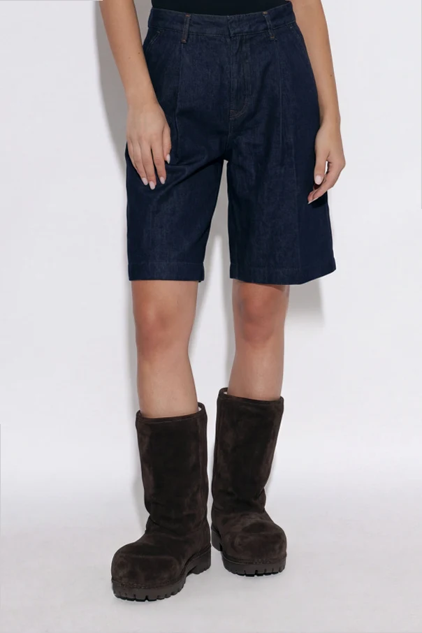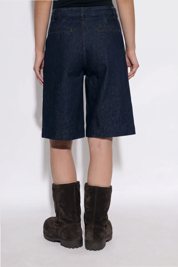 Elevate your summer wardrobe with these luxurious navy denim shorts from FRAME’s exclusive collection. Crafted from premium, smooth cotton denim, these shorts offer a refined interpretation of classic Bermudas—showcasing a relaxed, gently flared silhouette that grazes the knees for sophisticated ease and comfort. Distinctive mustard-hued topstitching accentuates the exquisite cut, while the deep, slanted front pockets add practical elegance. Thoughtful details such as discreet belt loops and a subtle back faux pocket ensure a minimalist and timeless aesthetic, free of overt branding. Why choose this product? Made from high-quality, smooth cotton denim Modern, loose fit inspired by classic Bermuda style Deep, angled front pockets for added functionality Distinctive contrast stitching for understated sophistication Timeless navy color for effortless versatility