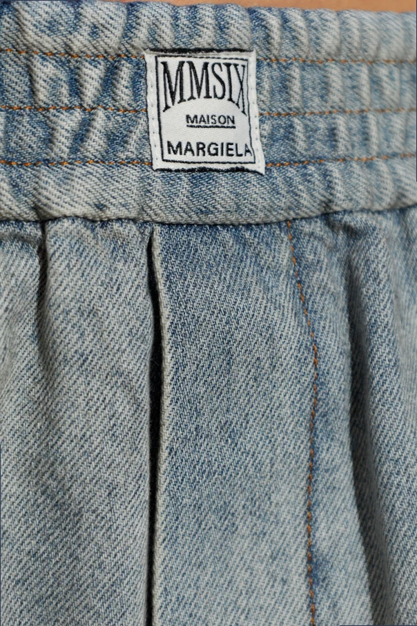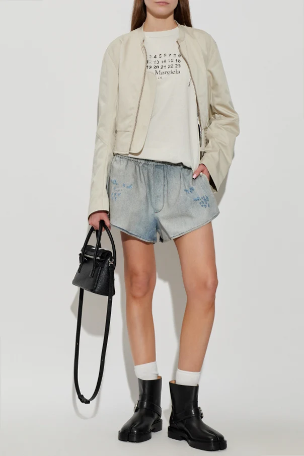 Exquisitely crafted from premium cotton denim, these light gray turtleneck shorts by MM6 Maison Margiela epitomize refined ease with a contemporary edge. Gracefully rounded, subtly flared legs complement a relaxed silhouette, while a wide, elastic waistband ensures impeccable comfort and a flawless fit. The denim's distinctive texture is artfully accented by delicate, irregular blue prints—evoking abstract floral motifs and lending a unique, individual charm. A signature designer label at the front, featuring the unmistakable MM6 MAISON MARGIELA inscription, certifies the shorts’ exclusive provenance. With no visible front closure, the look remains clean and effortlessly modern. These shorts offer a poised statement for those who appreciate avant-garde, conceptual fashion. Why choose this product? Immaculate light gray denim with artisanal texture Exclusive MM6 Maison Margiela design for the discerning collector Striking blue motif detailing for a distinctive aesthetic Wide, comfortable waistband enhancing effortless wear Uncompromising craftsmanship and conceptual style