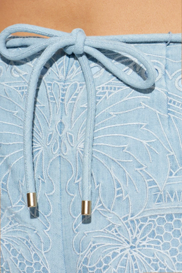 Imbued with an air of effortless sophistication, these light blue denim shorts by Zimmermann marry classic tailoring with exceptional artistry. Crafted from pure cotton, their silhouette showcases a thoughtfully accentuated waist, elegantly adjustable with a color-matched drawstring adorned by polished silver-tone tips.