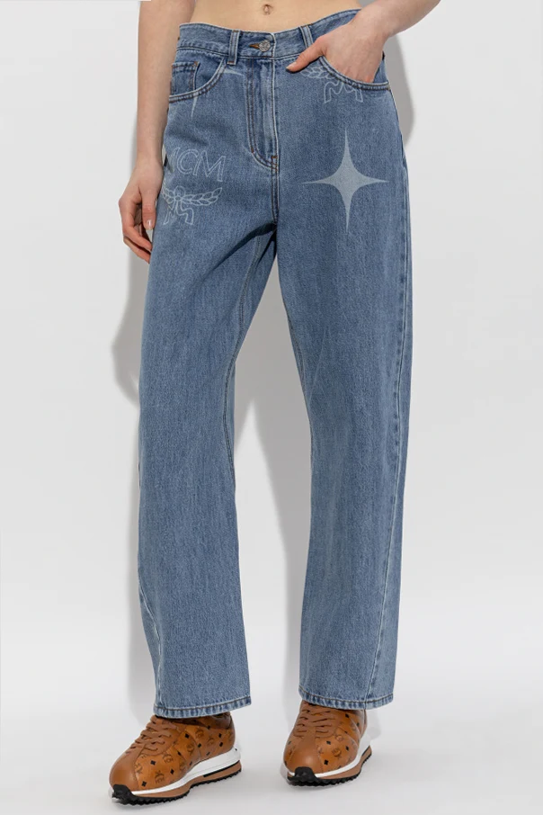 The wide, straight silhouette pairs effortlessly with a classically set waist, while the left leg showcases a distinctive light star print, elegantly accented by the designer's logo just above. Classic, unembellished rear pocket stitching and signature copper rivets underscore refinement and durability. The design is completed with a cognac leather patch, embossed with the signature MCM motif, affixed at the back waistband, and a timeless five-pocket construction for unparalleled functionality.