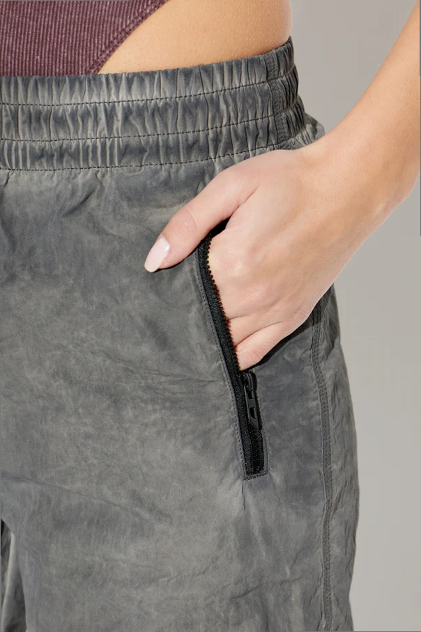 A wide, elastic waistband with elegant ruching at both the front and back ensures optimal comfort and a personalized fit, while the cuffs are finished with elastic and discreet gathers for a distinctive touch. Signature to the cargo style, the pants boast sleek side pockets with black zip closures and meticulous topstitching, suggestive of expertly placed pleats or thigh pockets. Two classic back pockets and pronounced horizontal seams along the legs complete the ensemble, reinforcing the garment’s unique identity.