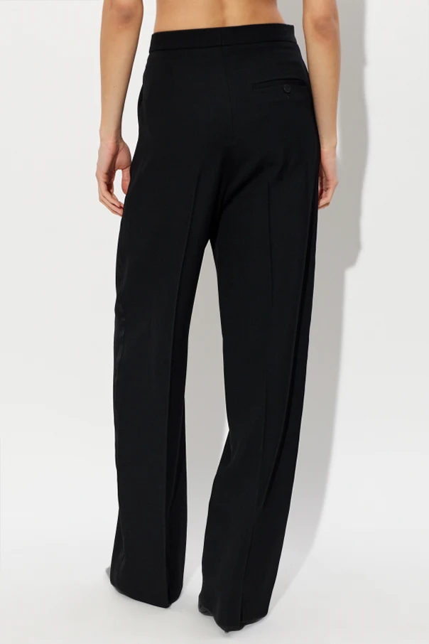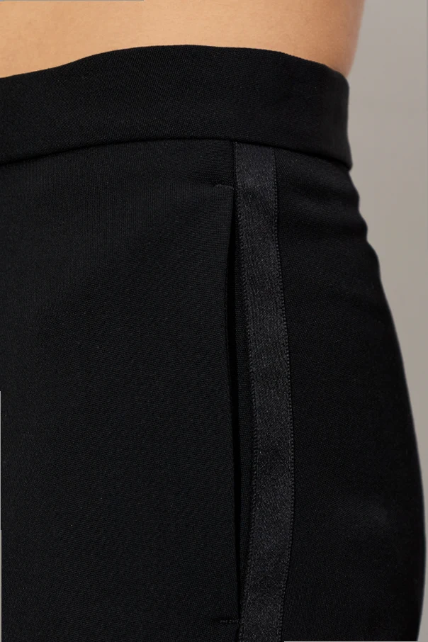 Thoughtful detailing includes a wide waistband that accentuates the waist, a discrete zip and concealed button at the front for a polished finish, and a signature satin stripe running subtly along each leg—distinguishing these trousers from traditional designs. A buttoned back pocket adds both practicality and a refined touch.