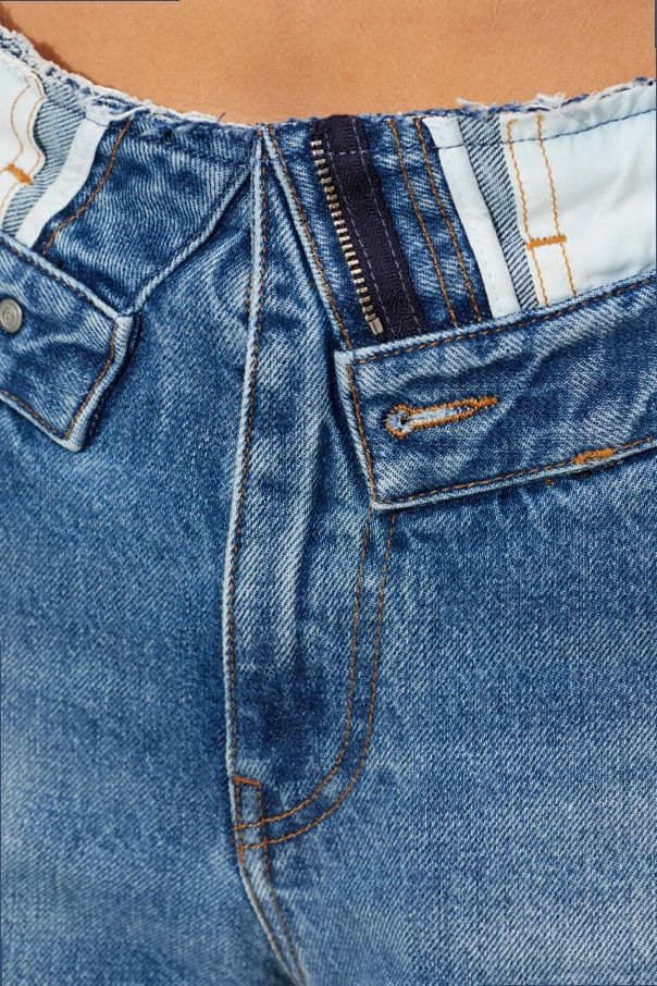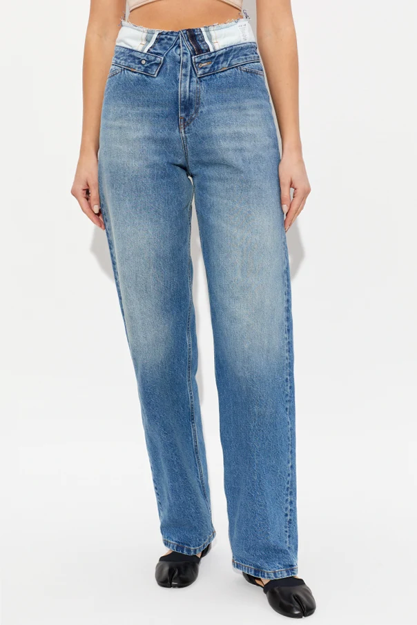 Experience modern sophistication with these straight-leg jeans in a refined medium blue denim. Impeccably crafted by MM6 Maison Margiela , this design boasts an elongated high-rise silhouette with an extraordinary, raw-edge waistband—featuring a distinctive double-layered construction and two lines of buttons. Intricate contrast stitching and a unique, frayed finish underscore the meticulous attention to detail.