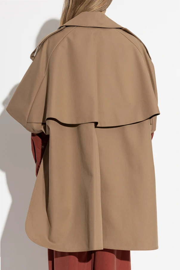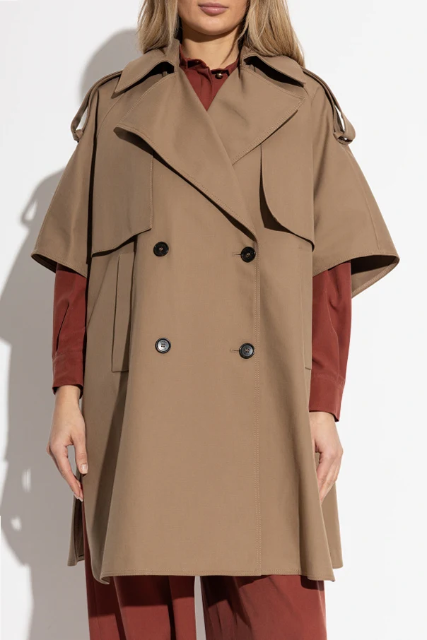 Distinctive details include a double-breasted closure with visible black buttons, a wide trench collar, decorative epaulets adorned with buttoned tabs, and straight patch pockets at each side. The signature broad cape yoke, front and back, pays homage to the house's iconic tailoring tradition. Subtle engraved logos on the buttons highlight Max Mara’s commitment to artisanal craft and luxurious minimalism.