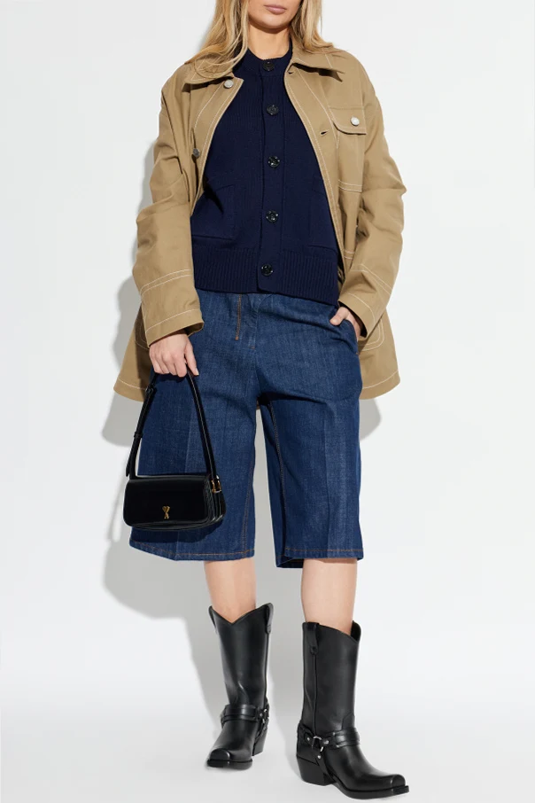 Evoke refined confidence with these dark navy denim shorts from AMI Alexandre Mattiussi . Embodying a Parisian approach to contemporary style, these knee-length shorts are crafted from high-quality, robust cotton denim, notable for its pronounced weave and distinctive texture. The sleek, uninterrupted dark wash imparts a polished, timeless allure, free from artificial fading or distressing.
