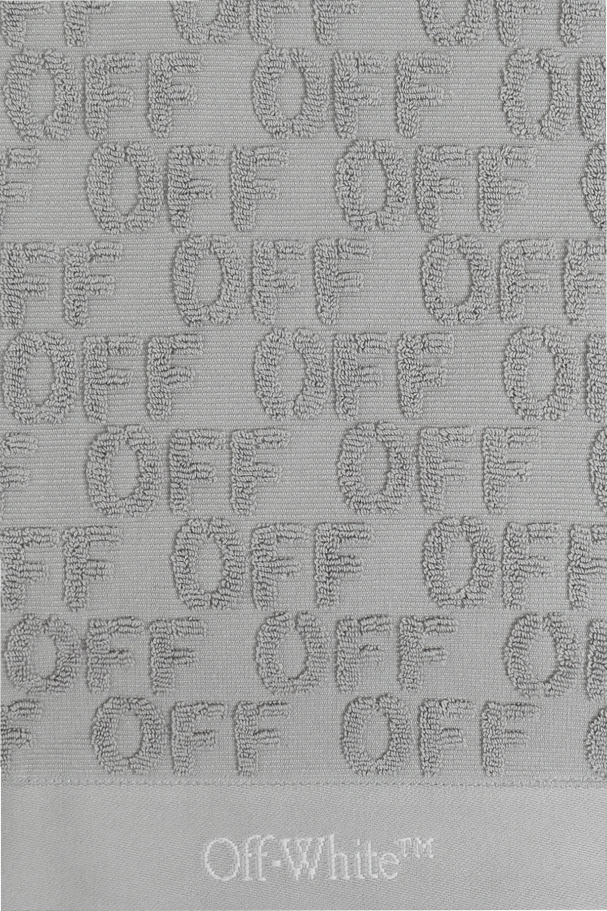 Introducing the Off-White™ Logo Towel, an epitome of luxury and sophistication, designed by the illustrious brand Off-White. This exclusive piece seamlessly combines minimalistic elegance with superior craftsmanship, making it a coveted item in the fashion world. Crafted from 100% high-quality cotton, the towel boasts a sumptuous texture that is both soft and durable. Its classic rectangular shape is adorned with a distinctive repeating \"OFF\" pattern, meticulously embroidered to create a three-dimensional effect, adding depth and character. The dominant gray hue imparts a sleek, modern aesthetic, while the white embroidered Off-White™ logo at the bottom accentuates its authenticity and exclusivity. A signature blue tag bearing the \"Off-White™\" inscription on one corner further enhances its unique appeal. Why Choose This Product? Exceptional Quality: Made from 100% premium cotton, ensuring softness and longevity. Iconic Design: Features a distinctive embroidered \"OFF\" pattern and exclusive logo detailing. Versatile Elegance: Perfect for both beachwear and everyday use. Unisex Appeal: Suitable for all genders, catering to a diverse clientele. Renowned Brand: Designed by Off-White, a trailblazer in contemporary fashion.