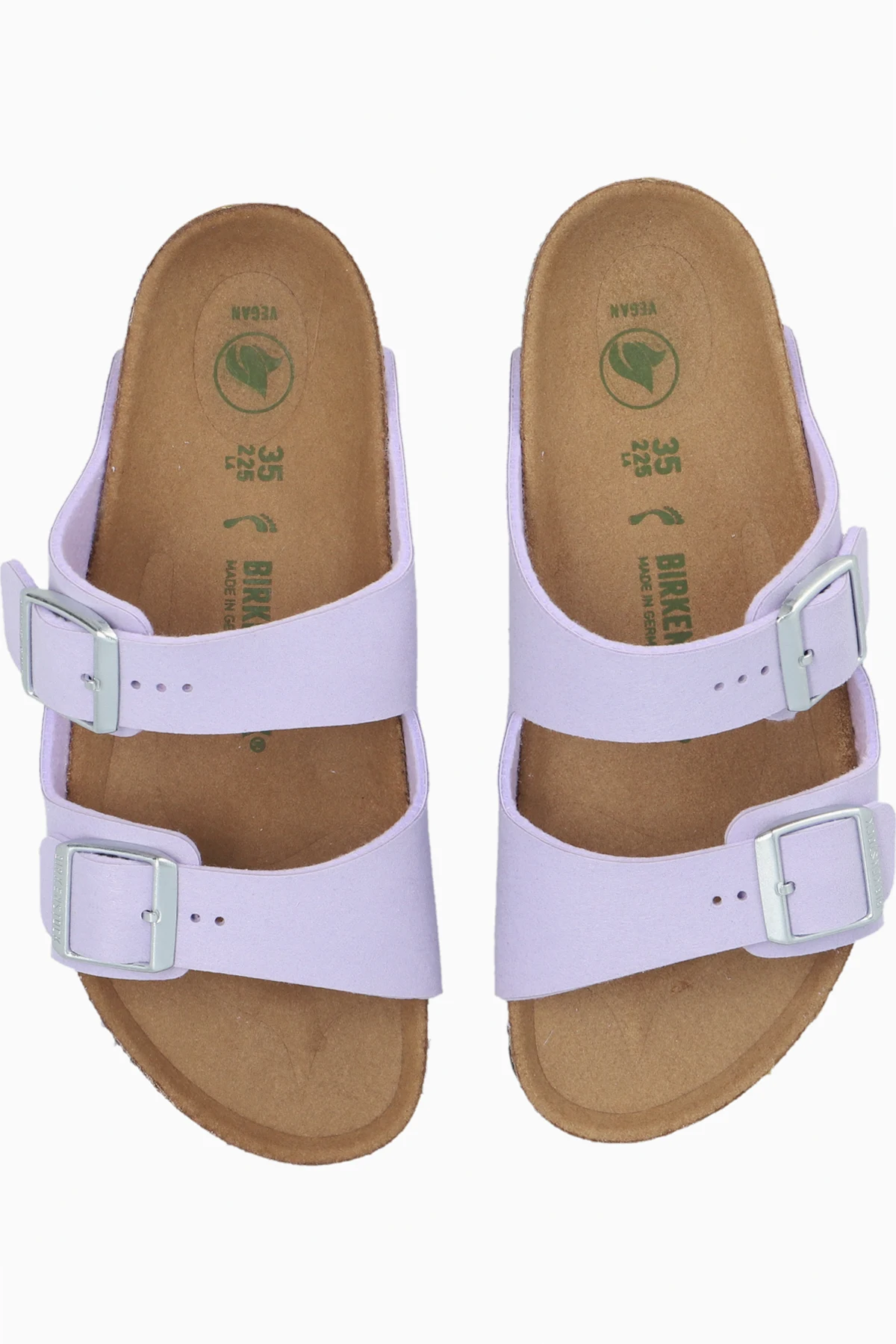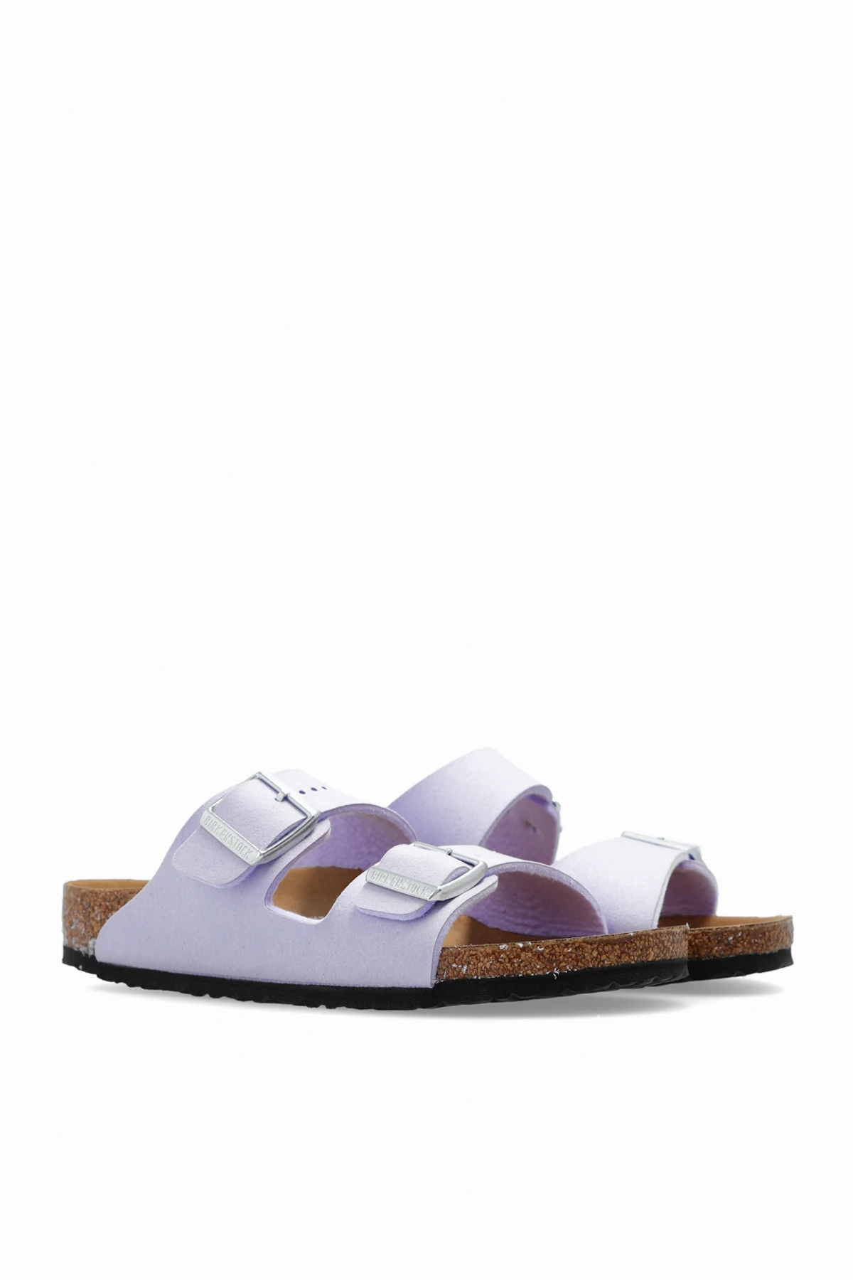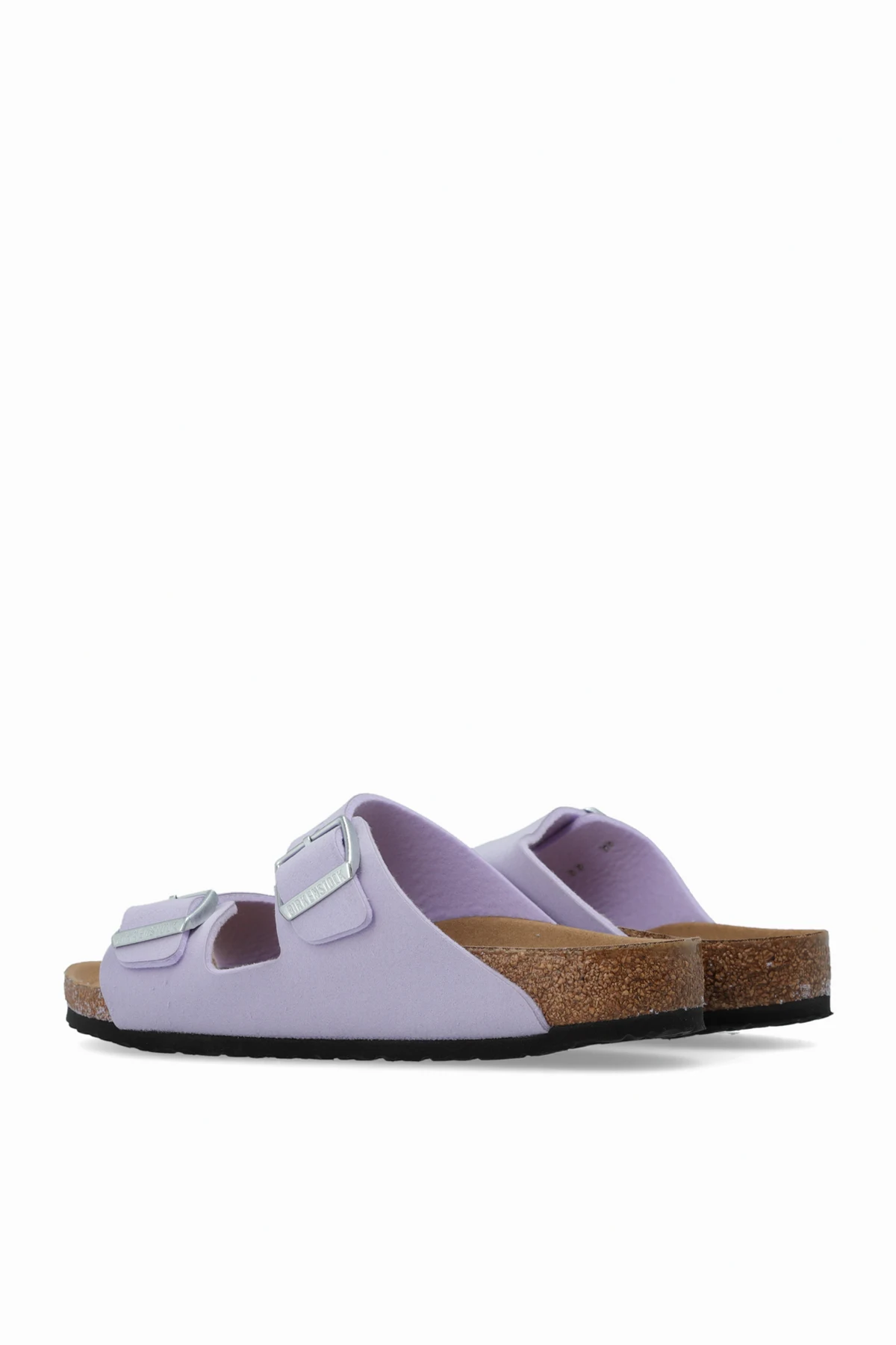 Light purple ‘Arizona’ vegan slides from Birkenstock Kids. Crafted from soft material, this model sits on a black EVA foam and adjusts via buckle straps. It is features a logo print on the side and an anatomically-shaped cork-latex footbed. Narrow width.