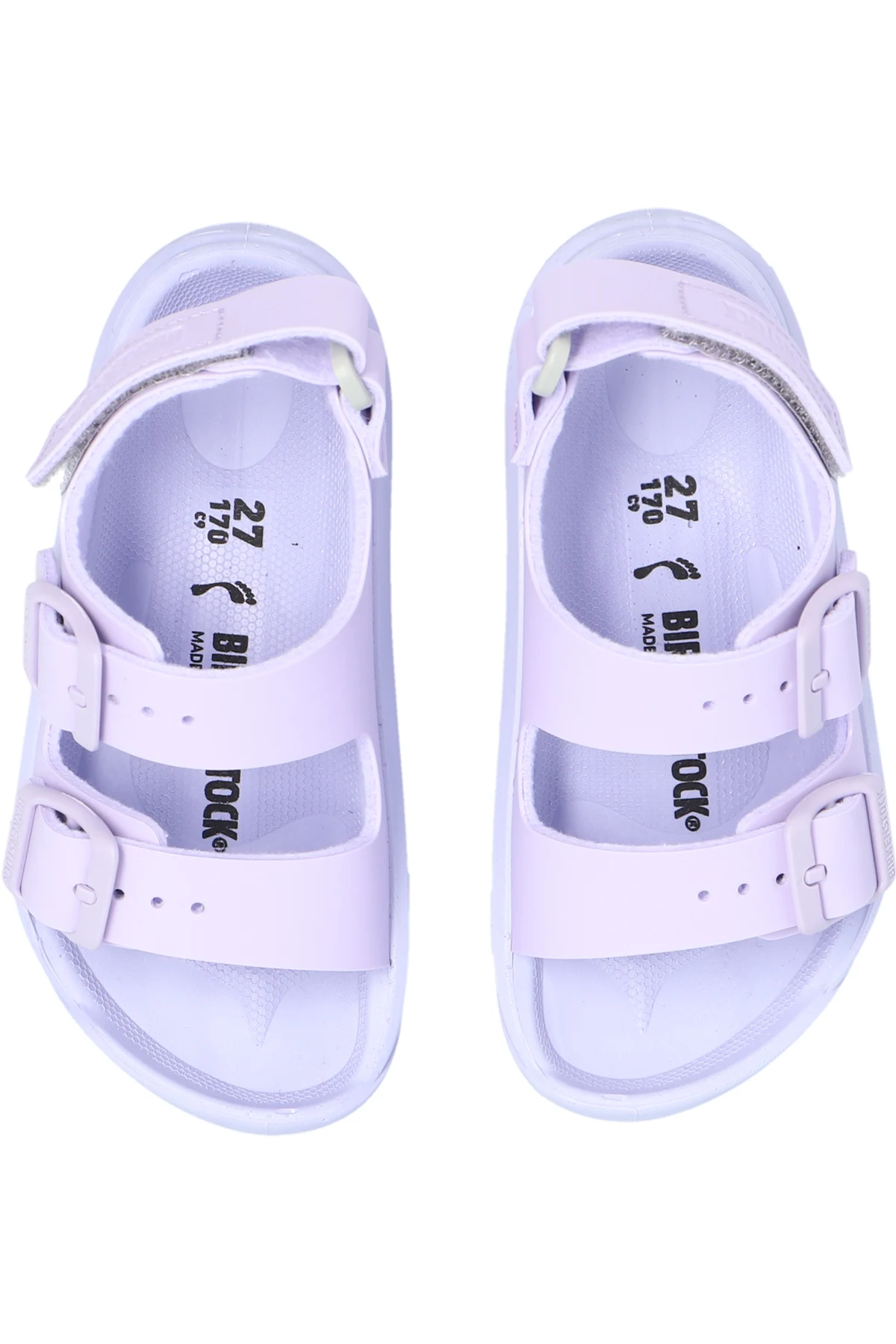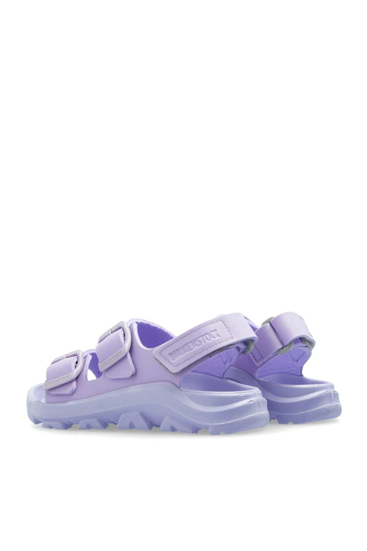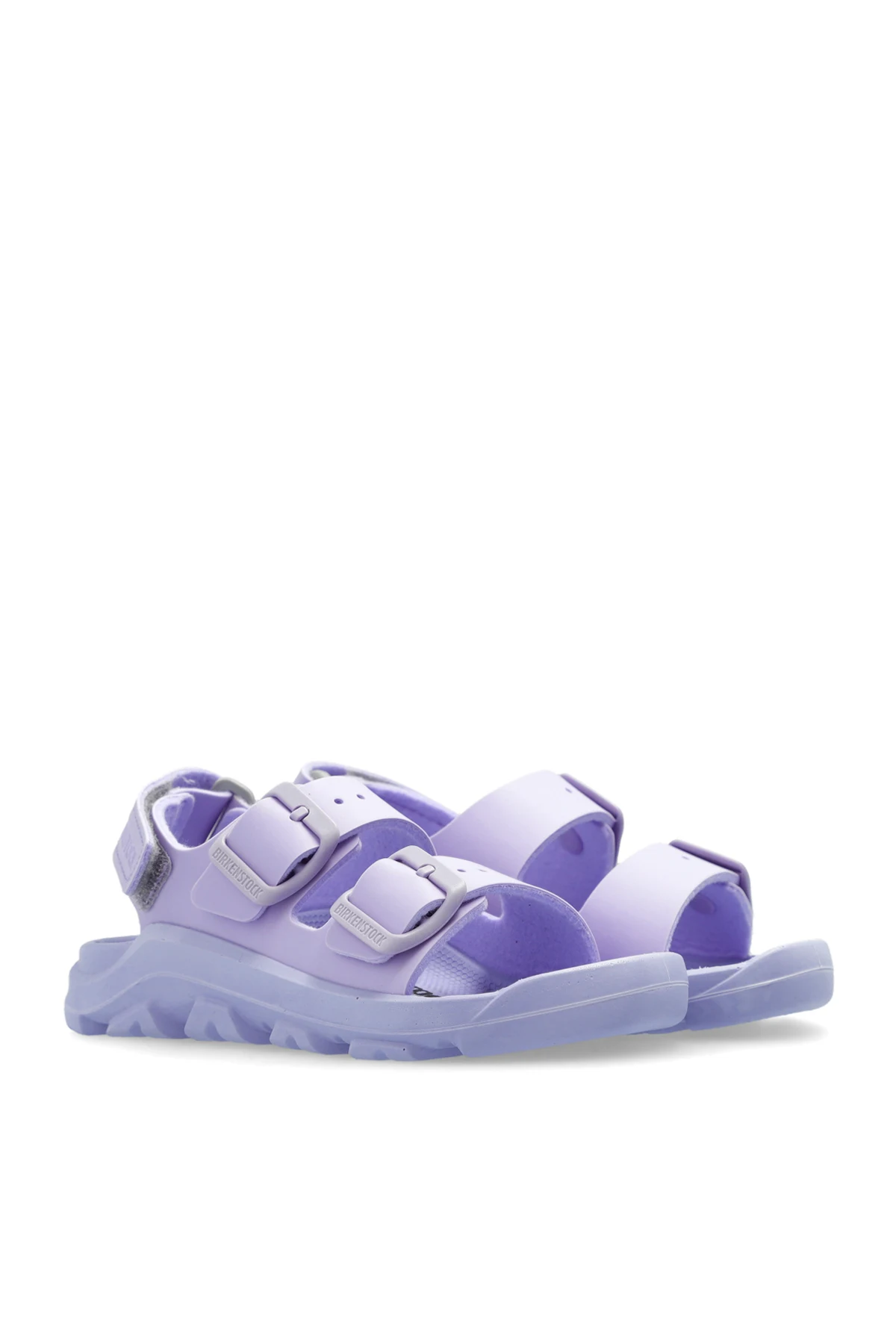 Introducing the Sandal \'Mogami\' by Birkenstock Kids, a testament to refined comfort and timeless design. Bathed in a serene shade of pastel purple, these sandals offer a subtle yet striking visual appeal that complements any summer ensemble. Crafted with the innovative Birko-Flor® for the exterior and a plush polyurethane lining, the Mogami sandals promise durability without compromising on softness and comfort. The design features an open structure with two broad straps across the front and an additional heel strap for enhanced support, each adorned with adjustable buckles that blend functionality with a touch of elegance. The presence of the designer\'s logo embossed on the heel strap distinguishes these sandals as a genuine Birkenstock creation. A meticulously designed rubber sole with a pronounced texture ensures optimal grip, making every step secure. Why Purchase the \'Mogami\' Sandals? Superior Comfort: The plush lining and ergonomic design ensure all-day comfort. Exquisite Design: Pastel purple hue and refined buckle details offer a chic look. Unparalleled Quality: Crafted from premium Birko-Flor® and polyurethane materials for durability. Signature Branding: Embossed logo adds a mark of authenticity and prestige. Enhanced Traction: Robust rubber sole provides excellent grip and stability.