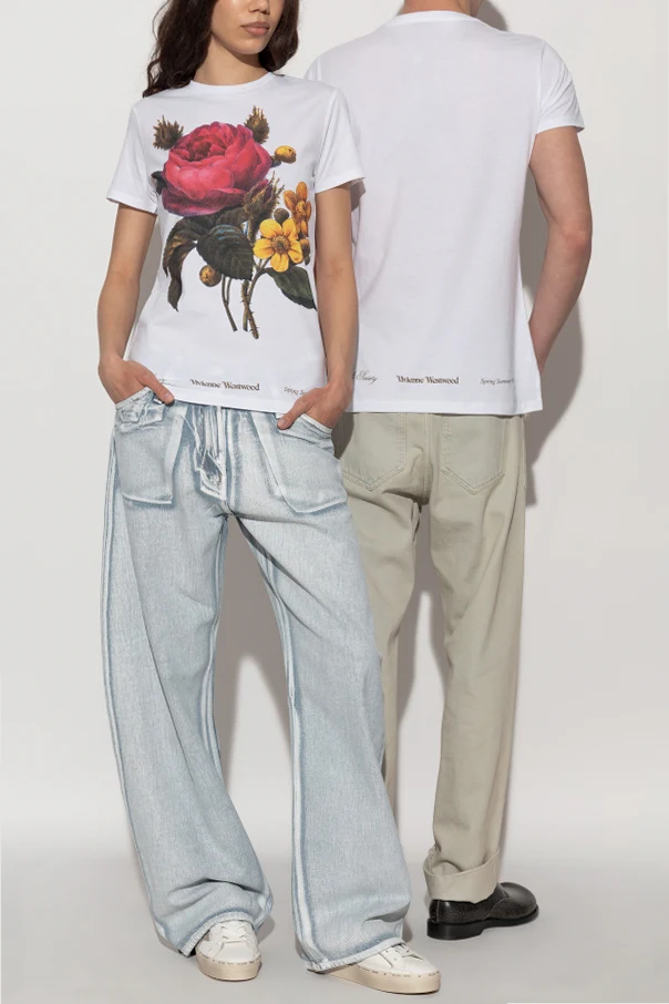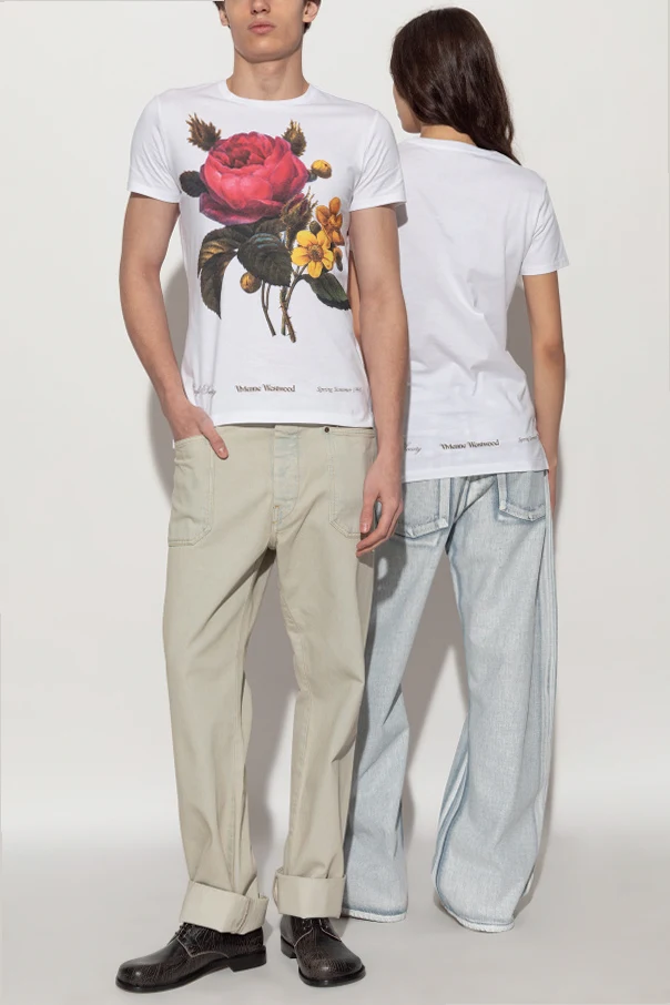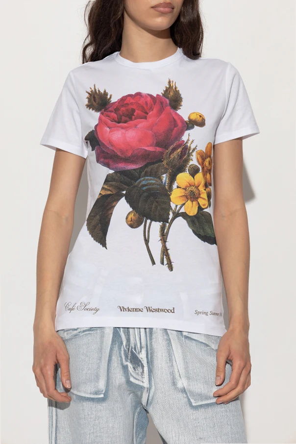 The T-shirt features a striking, lifelike floral print—a bold red rose encircled by yellow blossoms and lush green leaves —capturing attention with its vivid details. Distinguished by the Vivienne Westwood logo artfully printed below the design and subtle, exclusive collection inscriptions at the sides, this piece radiates refinement and character.
