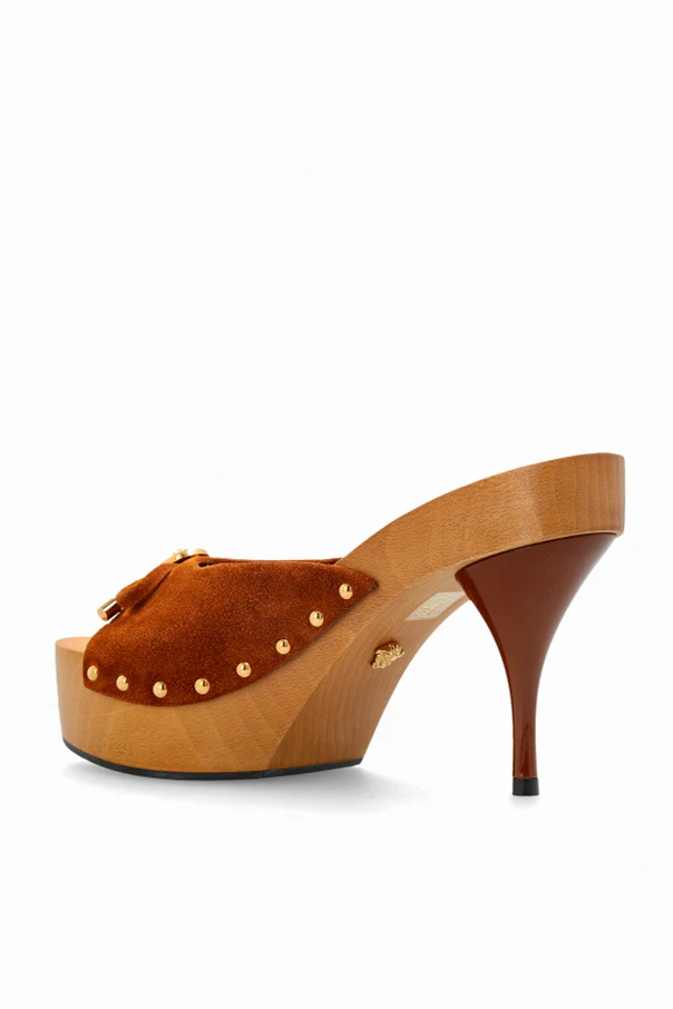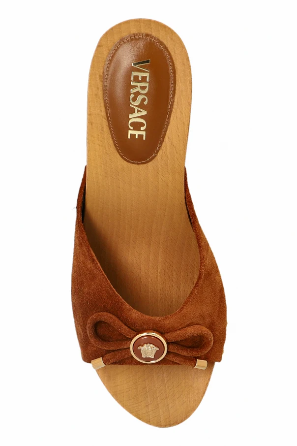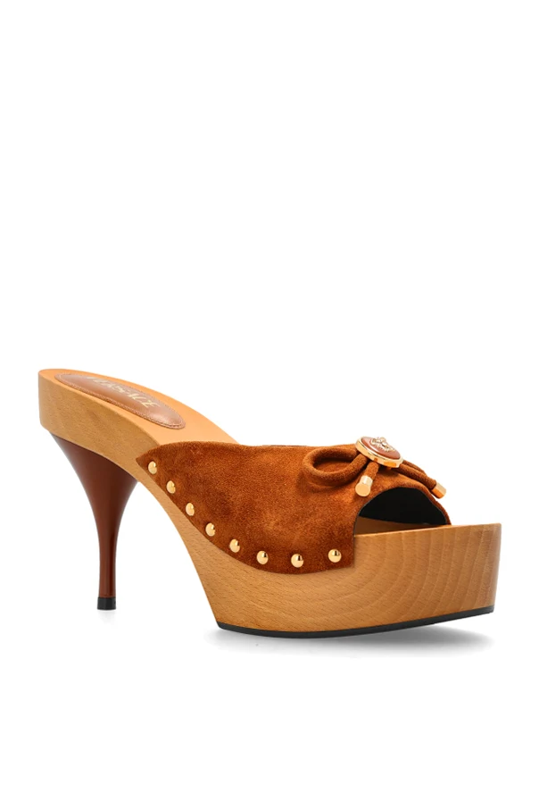 Embodying the spirit of refined audacity, these Versace platform mules in brown suede redefine contemporary elegance. The silhouette captivates with its sculpted, high-profile platform, slender stiletto heel, and alluring open toe, creating a sophisticated yet evocative presence. A stylized bow graces the upper, crowned by the brand's iconic Medusa head medallion—an unmistakable Versace signature. Meticulously crafted, the exterior boasts supple suede in a rich brown shade, accentuated by orderly golden studs lining the sides for distinctive allure. The platform and sole exude a wood-like finish, infusing subtle retro charm. The interior offers luxurious printed leather lining, adorned with the designer’s name underfoot, while the rubber outsole ensures comfort and poise with every stride. Why choose this product? Showcases Versace’s instantly recognizable Medusa emblem Premium brown suede construction with signature gold stud details Wood-effect platform for a bold, retro-inspired statement Luxurious leather lining for enhanced comfort and lasting quality An emblem of avant-garde Italian craftsmanship