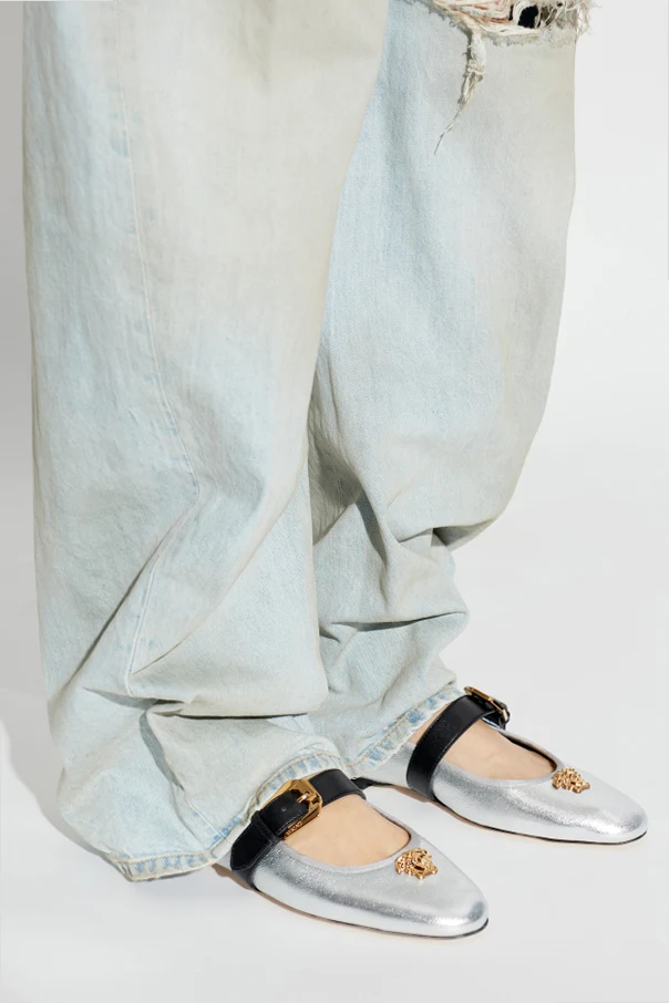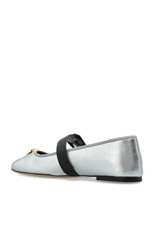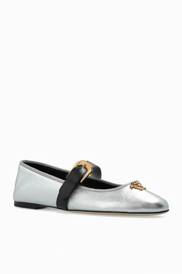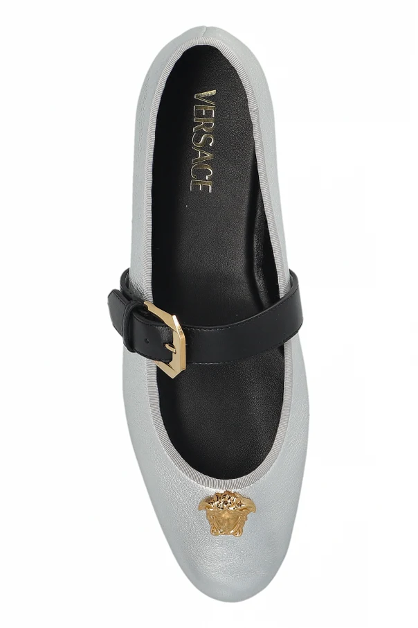 Epitomizing refined sophistication, these black leather ballerinas by Versace seamlessly blend Italian heritage with modern allure. The classic rounded toe and Mary Jane strap —accented by a striking gold buckle—accentuate the shoe’s timeless silhouette, while the high-shine, natural leather radiates understated opulence. Distinctive yet subtle, the graceful, smooth finish is elevated by the iconic, three-dimensional gold Medusa head at the front, a true hallmark of Versace’s legendary artistry. Inside, the insole is elegantly branded with the house’s name in gold, affirming exclusivity at every step. The neutral, light-toned sole and demure low heel provide comfort without compromising elegance. Why choose this product? Signature Versace Medusa emblem—a symbol of unique character and strength Luxurious, high-gloss natural leather for enduring style and luster Contrasting Mary Jane strap with refined golden buckle for artistic flair Impeccably smooth finish enhances versatility and sophistication Crafted by a world-renowned house synonymous with innovation and exceptional Italian craftsmanship