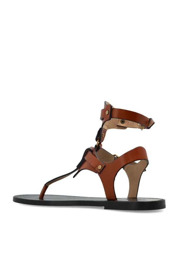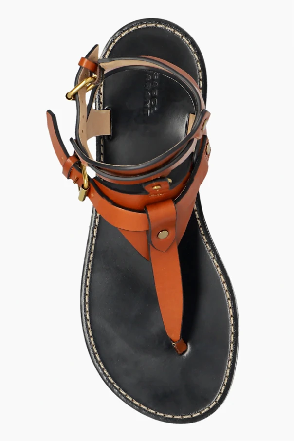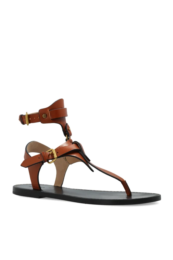The Eveena Sandals by Isabel Marant embody understated sophistication with their classic, minimalist silhouette in a rich brown hue. Expertly crafted from luxurious leather with a subtle satin finish, these flat sandals present a timeless T-strap design gracefully traversing the foot and between the toes. Wide straps gently wrap the ankle and heel, offering both comfort and exceptional stability.