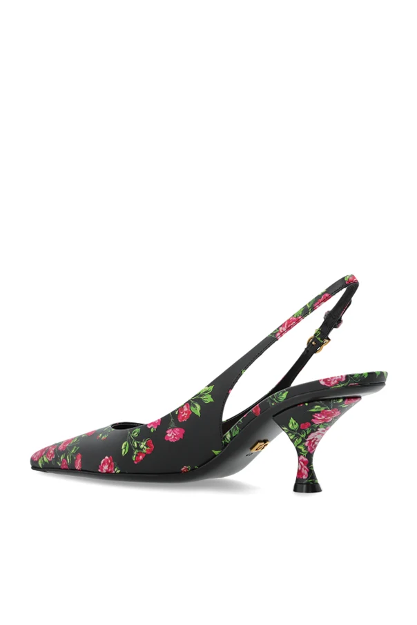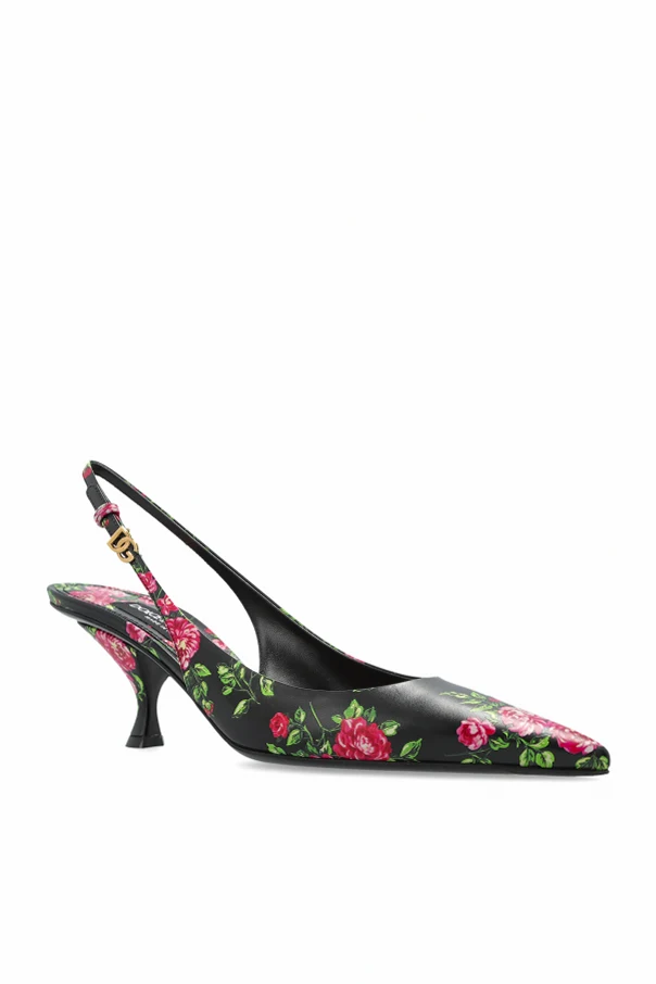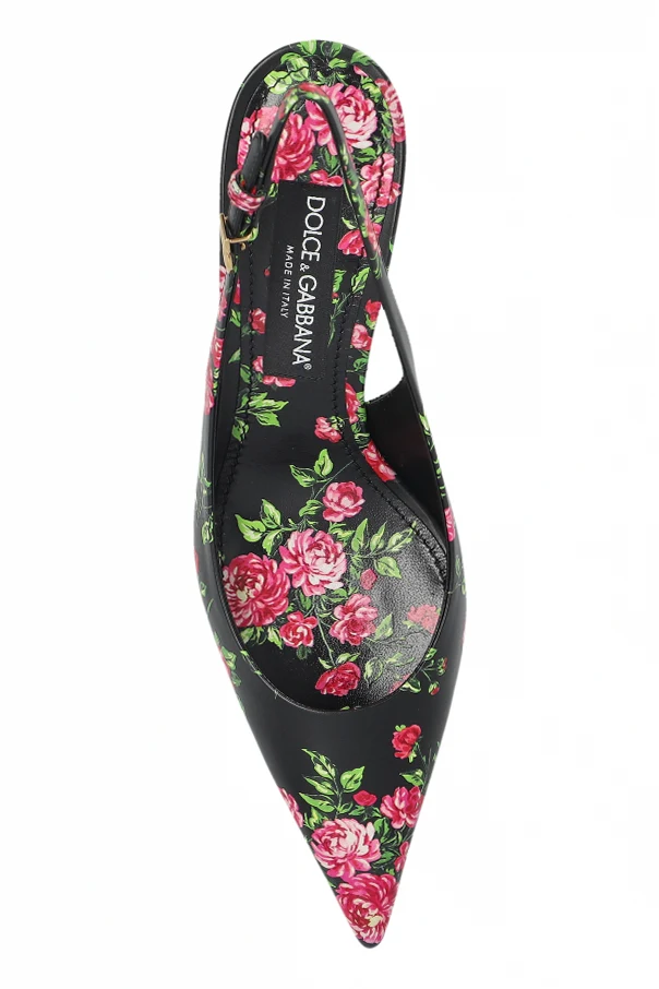 Indulge in refined splendor with the Lollo pointed toe slingback heels from Dolce & Gabbana . Crafted in lustrous leather with a satin-like finish, these heels enchant with an exuberant multicolor floral motif—most notably blooming roses—delicately adorning their surface. The timeless slingback silhouette, completed by a gracefully contoured kitten heel, imparts a poised yet effortless allure, while the adjustable ankle strap is adorned with a discreet jeweled buckle for a touch of sophistication.