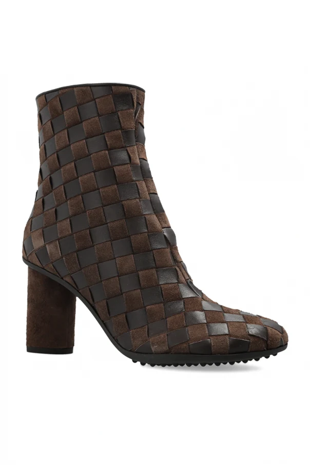 Experience sophisticated artistry with the ‘Atomic’ heeled ankle boots by Bottega Veneta . Crafted from an exquisite interplay of smooth leather and lush suede, these boots showcase a striking geometric weave—a three-dimensional checkerboard motif that sets them apart. The boot gracefully rises just above the ankle and sits atop a stable block heel, approximately 7–9 cm, marrying confident elevation with effortless balance.