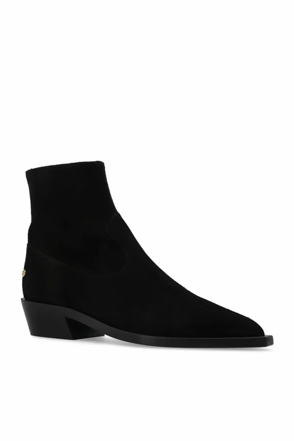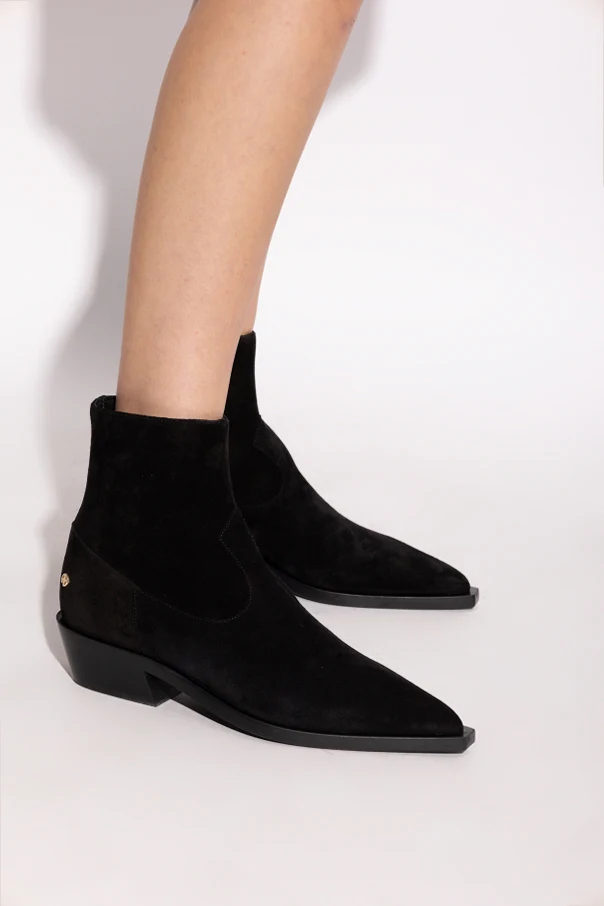 These luxurious black suede leather ankle boots from the Anine Bing exclusive collection embody refined modernity, balancing Scandinavian simplicity with American verve. The unmistakably elongated, pointed toe and ankle-skimming shaft create a sleek silhouette, while the mid-height cleaved heel ensures poise and enduring comfort.
