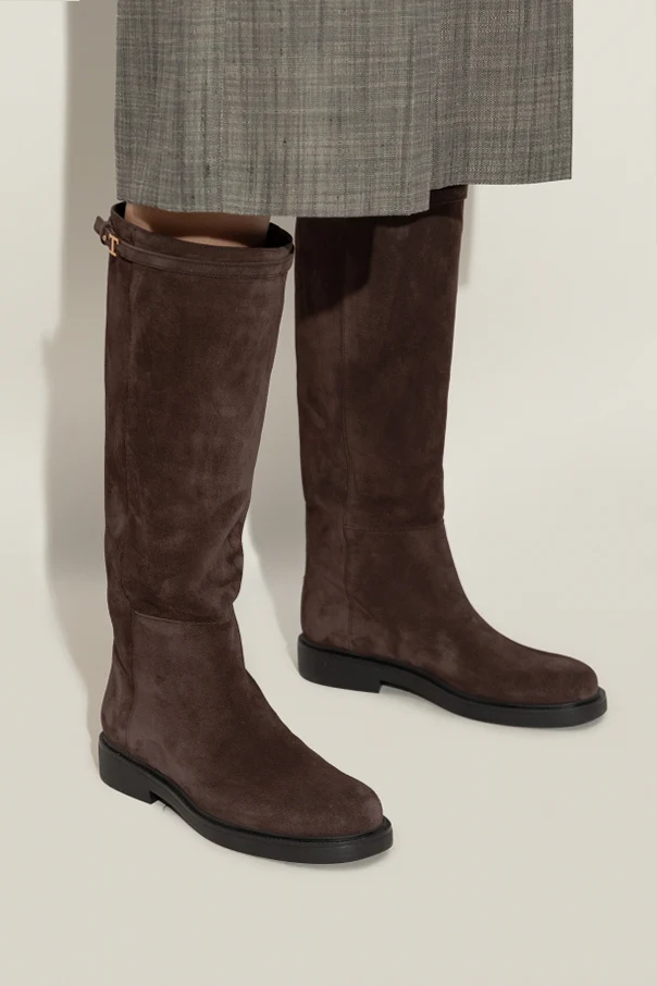 These boots are thoughtfully lined in supple leather for unparalleled comfort, while the robust, flat black rubber sole promises both resilience and contemporary flair. Attention to detail is evident in the slender suede strap adorned with a signature gold-tone buckle, gracefully inscribed with the designer’s initial, elevating the overall allure without excess ornamentation.