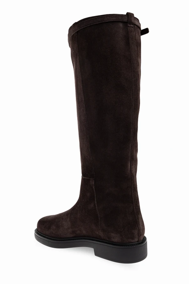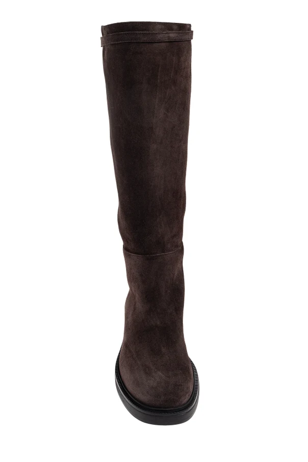 Indulge in understated sophistication with these exquisite suede knee-high boots by Tod’s . Impeccably crafted from the finest natural suede, their velvety, matte texture offers both visual and tactile delight. The classic, elongated silhouette is accentuated by a gently rounded toe and an unfussy, straight shaft reaching just below the knee—an embodiment of refined minimalism.