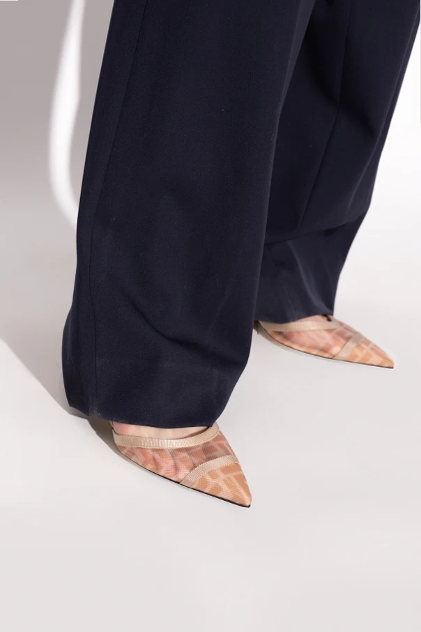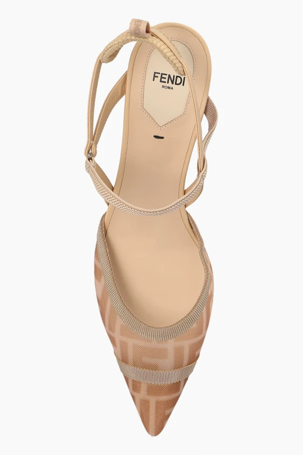 With a pointed toe and medium heel, these heels exude elegance and sophistication. The semi-translucent material with iridescent elements graces the upper, creating a subtle shimmer that captivates the eye. A distinctive pattern, possibly echoing Fendi's emblem, adorns the exterior, while crisscross straps add both support and a chic flair.