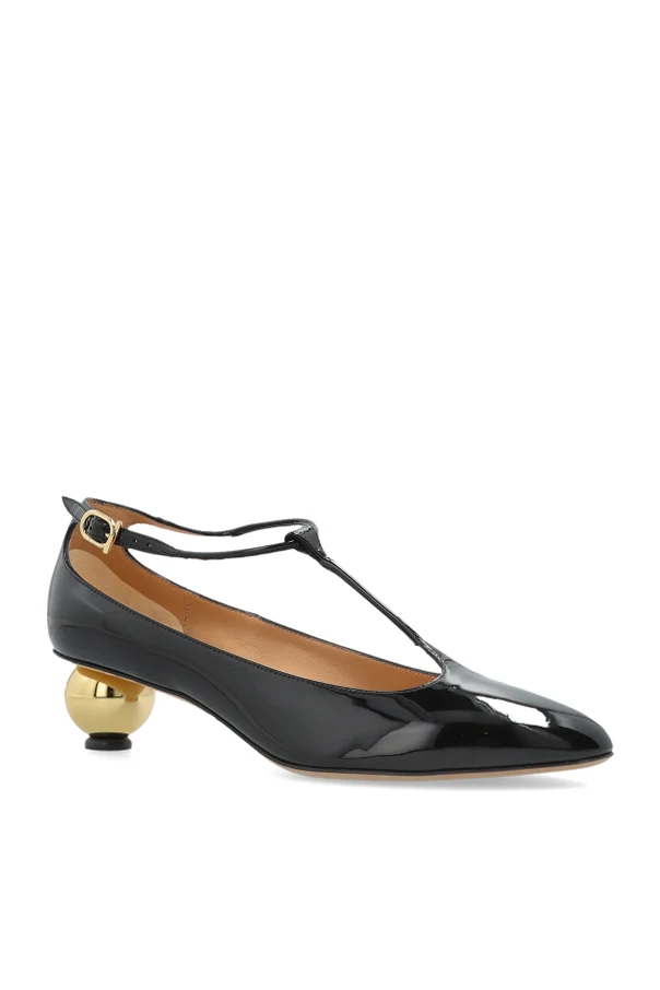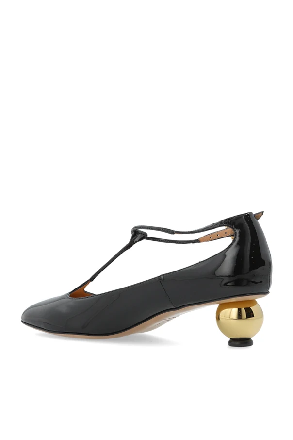 The true hallmark of these pumps is their distinctive, mid-height geometric heel : a bold, sculptural sphere fashioned from glistening golden metal, instantly elevating the overall allure. The striking black finish ensures endless versatility, seamlessly transitioning from day to evening with understated opulence.