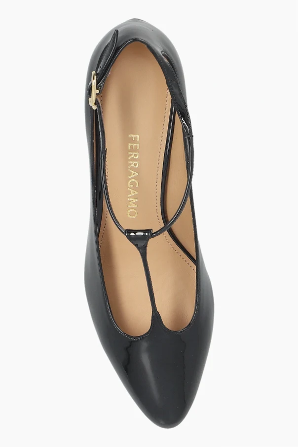 Radiating timeless sophistication, the Tania Pumps by FERRAGAMO exemplify Italian artistry at its finest. Meticulously crafted from lustrous, patent calfskin leather, these shoes boast a classic, gently elongated silhouette with a subtly rounded toe. The elegant T-bar strap —meeting a slender ankle band fastened with a refined metal buckle—enhances their graceful, feminine design.