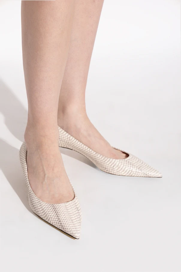 The creamy upper, expertly handcrafted from premium leather, boasts a refined, textured pattern reminiscent of exotic reptile scales. This unique finish imbues the shoes with an aura of modern luxury, while the deep, softly contoured cut showcases the foot with subtle elegance, artfully creating an elongated effect.