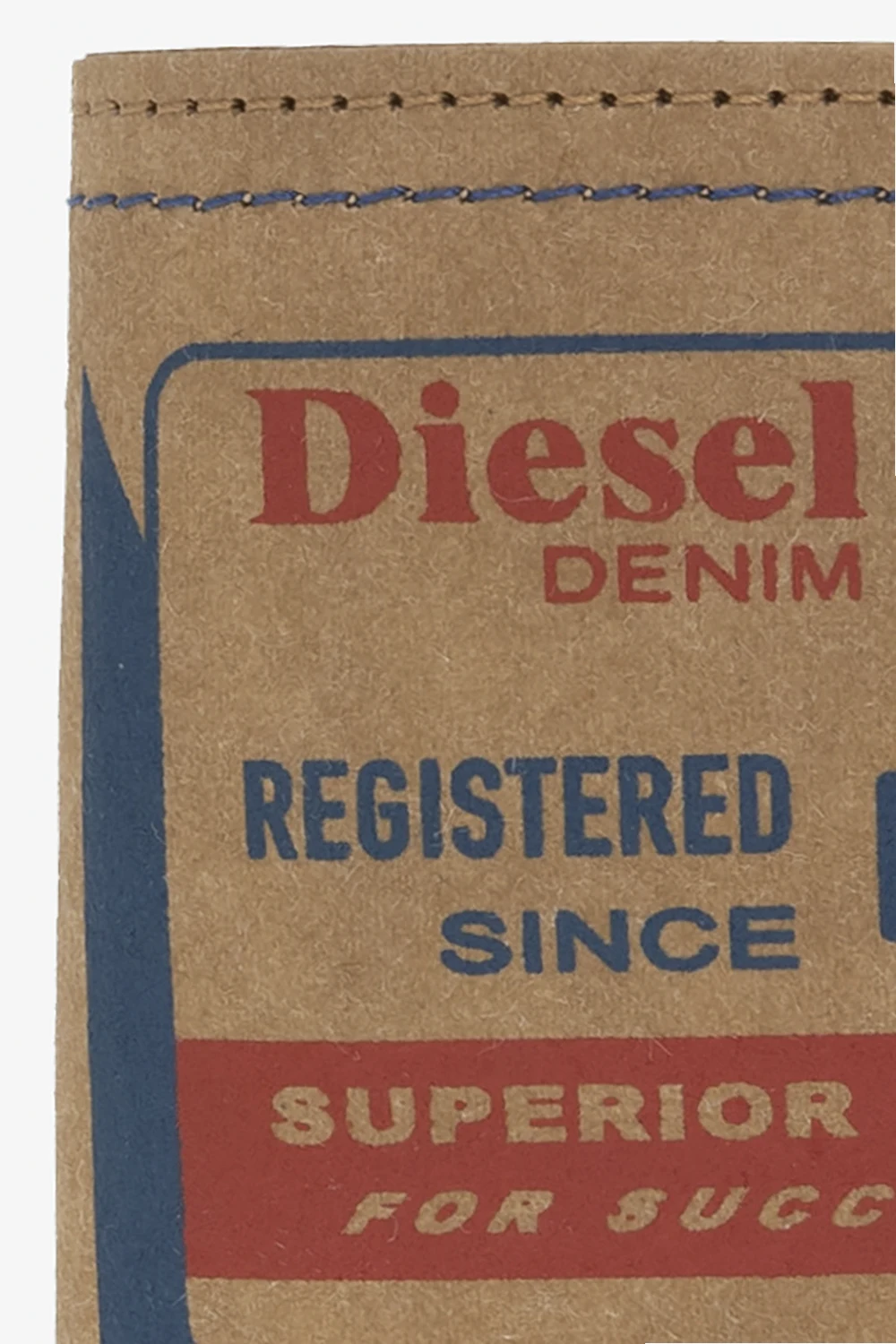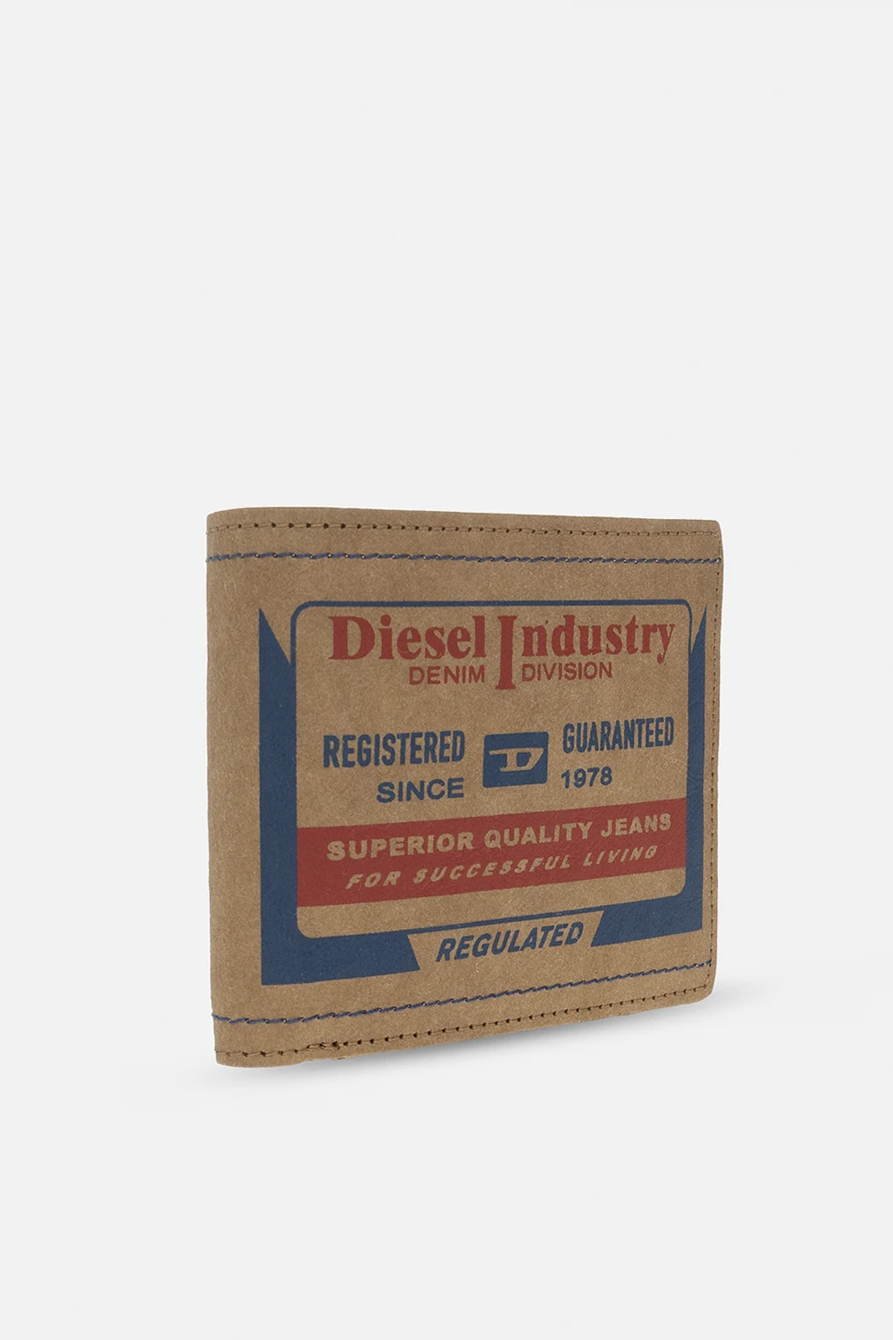Brown ‘JACKRON’ folding wallet from Diesel. Crafted from paper fibre, this design showcases a blue and red graphic print with the brand's logo. It is complete with two bill compartments, one snap-fastened coin pocket, three slip pockets and four card slots inside.