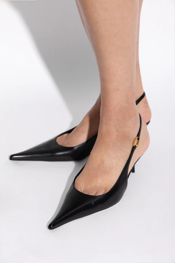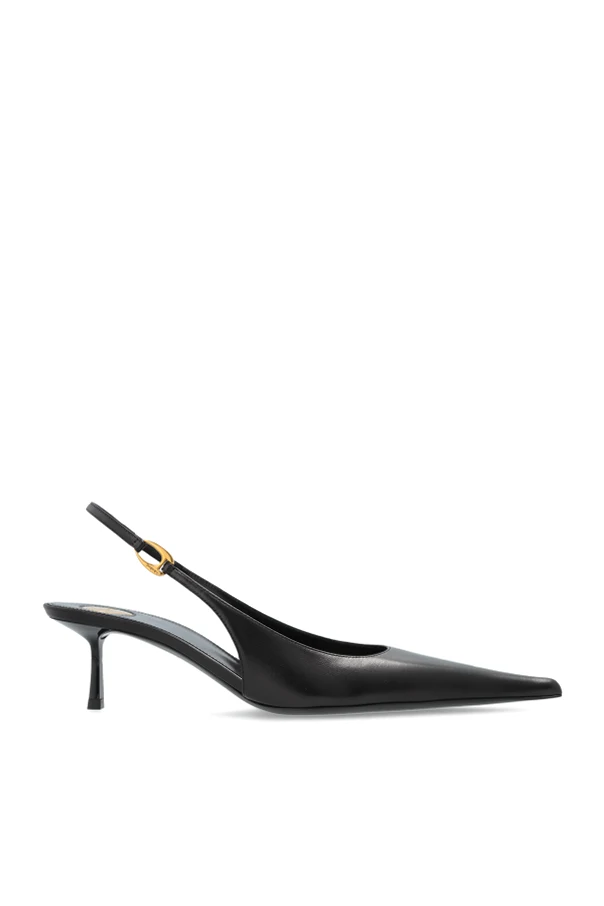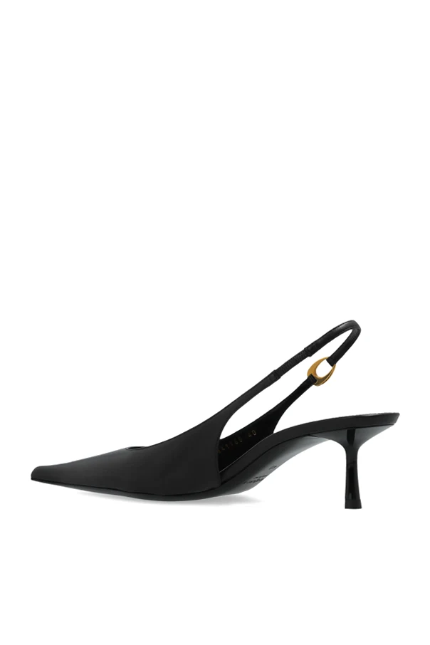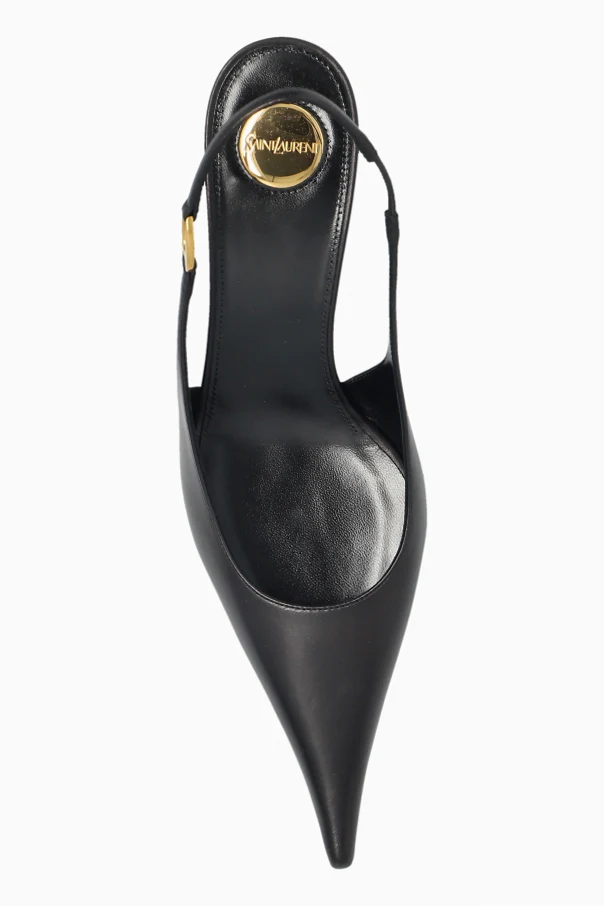 Step into the epitome of refined elegance with the Vendome Mid-Heel Pumps by Saint Laurent . Distinguished by their gracefully elongated, pointed toe and slender slingback silhouette, these heels present a stunning interplay between timeless allure and modern sophistication. The lustrous, satin-finish leather upper exudes luxury, while the exposed heel and delicate ankle strap, adorned with a gold buckle, offer both practical functionality and a captivating decorative accent.