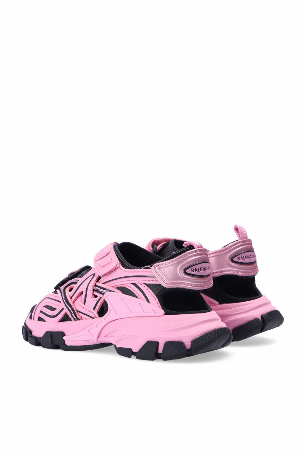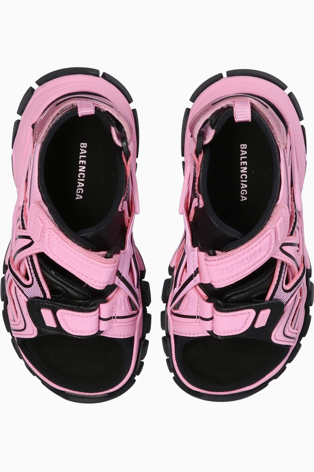 Pink and black ‘Track’ sandals from Balenciaga Kids. Fastened with velcro, this pair features an embossed logo, decorative cut-out details and a rubber sole in pink and black.