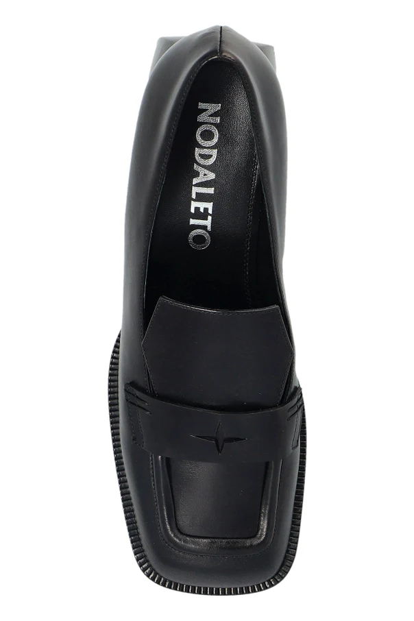 The sleek, high-gloss black leather creates a dramatic silhouette, accentuated by a square, gently rounded toe for a modern yet timeless profile. A singular horizontal strap, detailed by a subtle cross-shaped cutout, elevates the minimalist design, while the interior bears a prominent silver “NODALETO” inscription, unmistakably defining its premium pedigree.