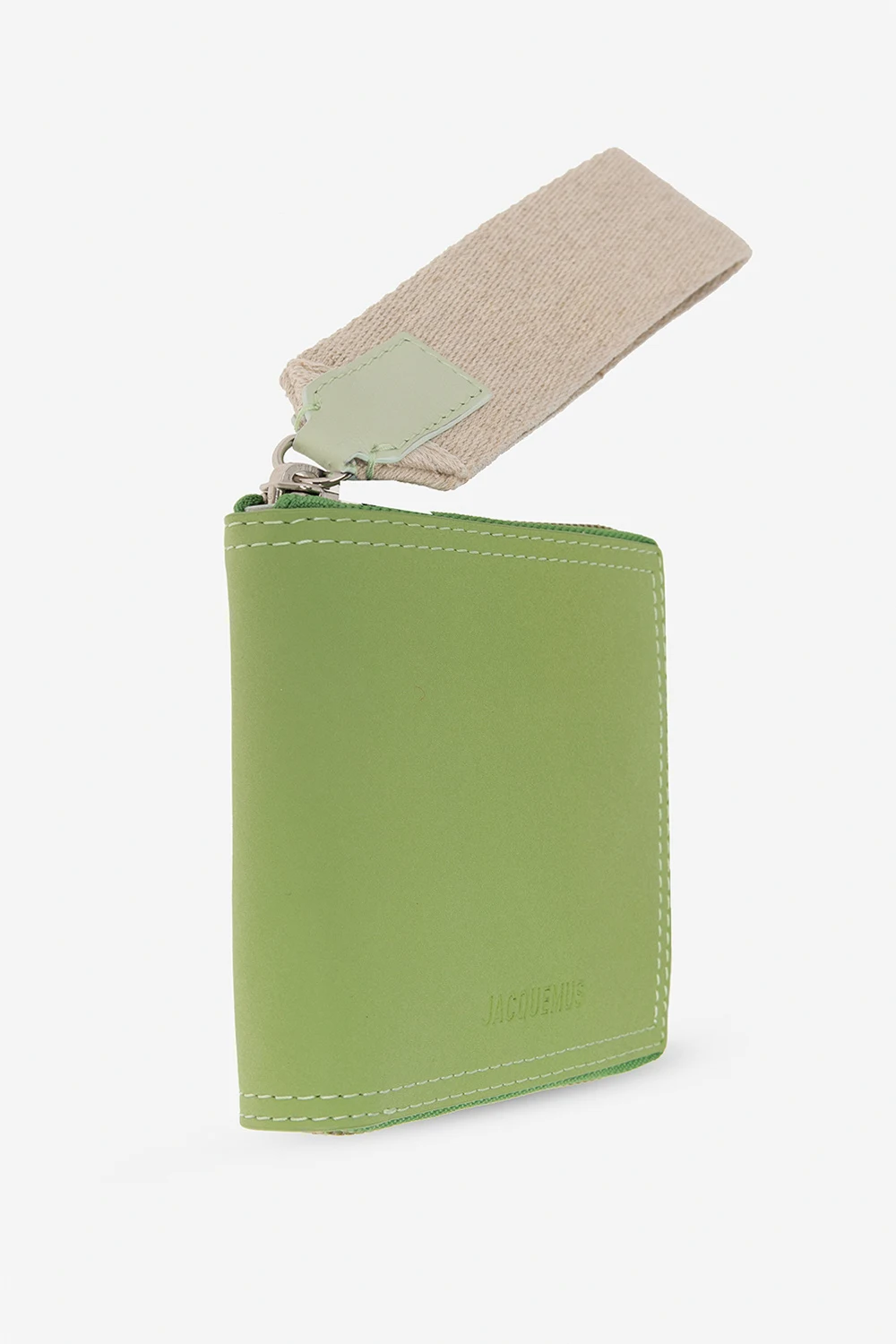 Green ‘Le Carre Rond’ wallet from Jacquemus. Crafted from leather, this design secures with a zipper with a cream canvas wrist strap and features an embossed logo on the front and a bill compartment, one slip pocket, a round zip coin pocket and four card slots inside.