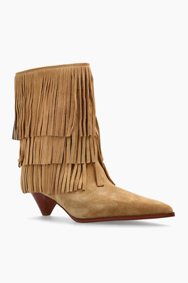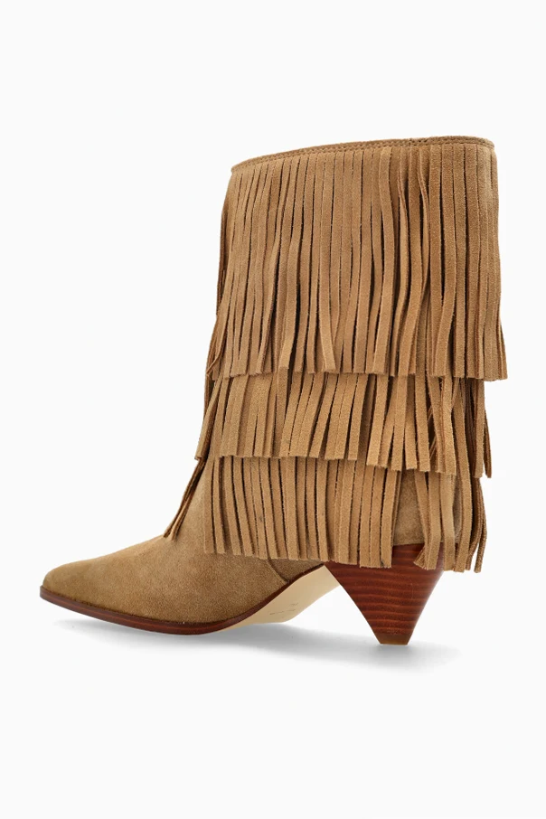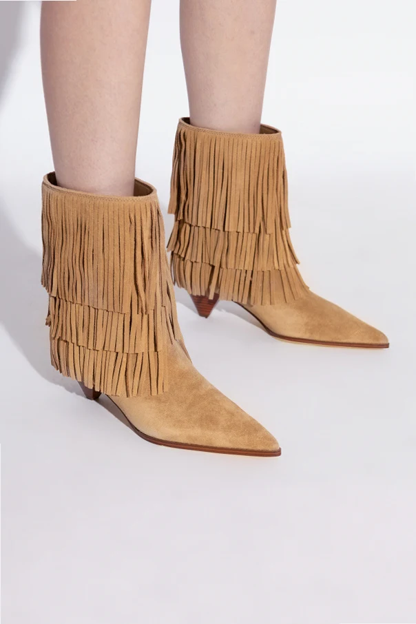 The distinctive horizontal layers of elongated suede fringe create captivating movement and rich textural appeal, capturing the essence of refined bohemian luxury. Inside, a golden designer insignia graces the leather insole, underscoring the authenticity and prestige of this iconic American brand. A resilient rubber outsole ensures lasting comfort for every step.
