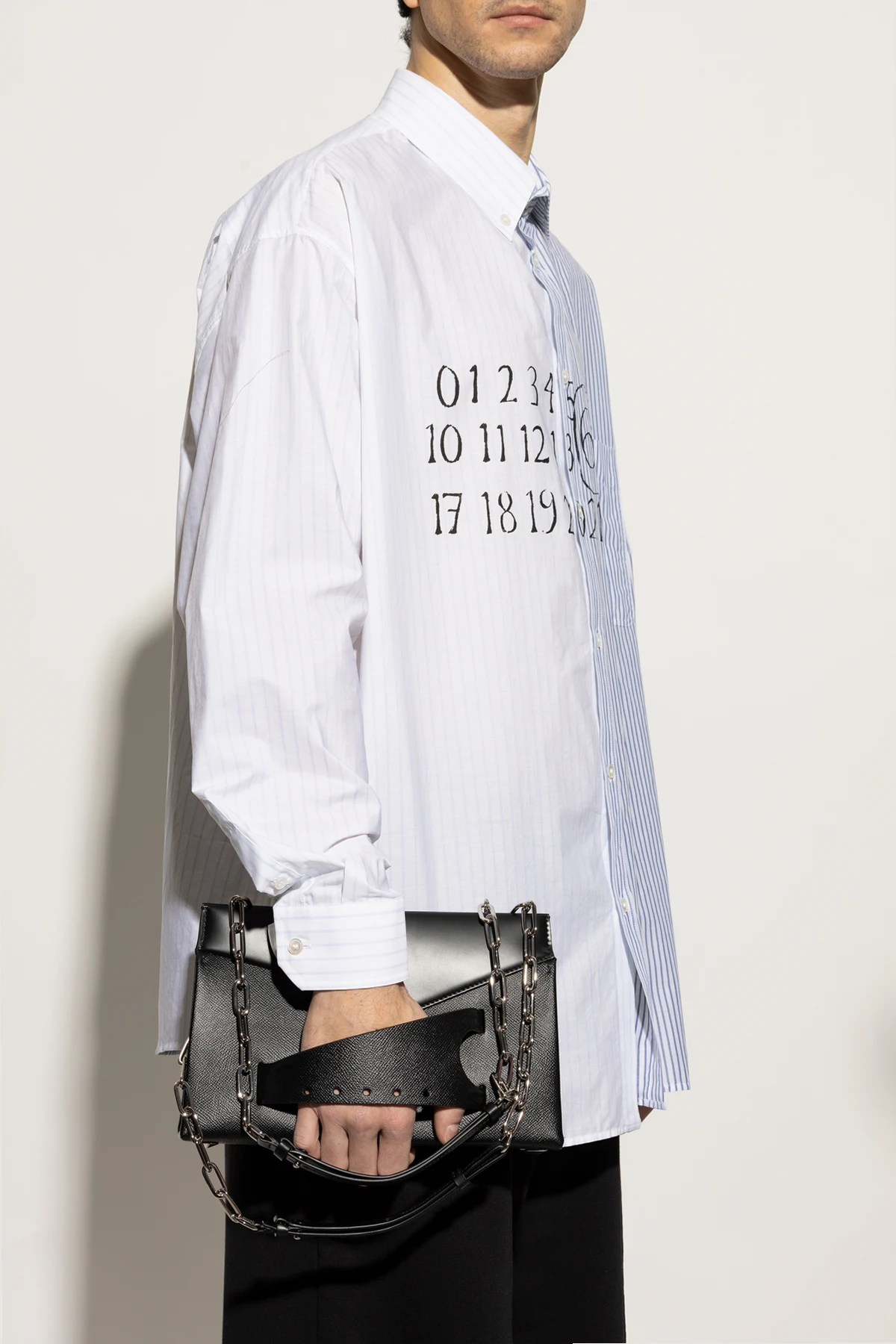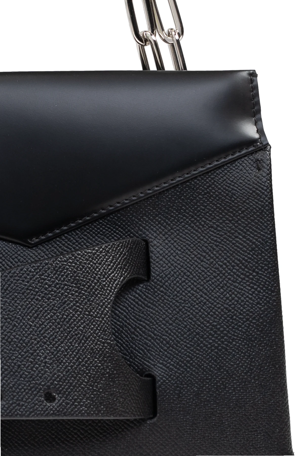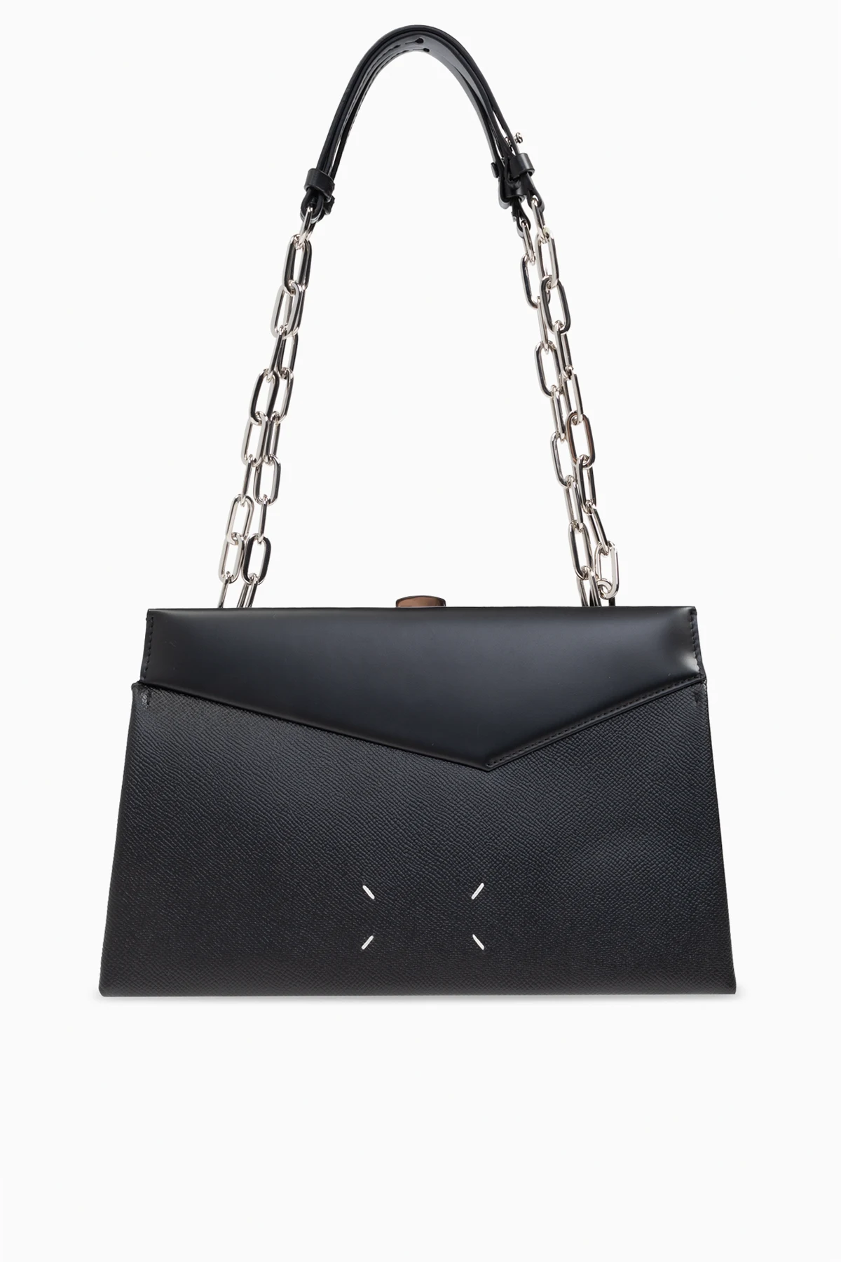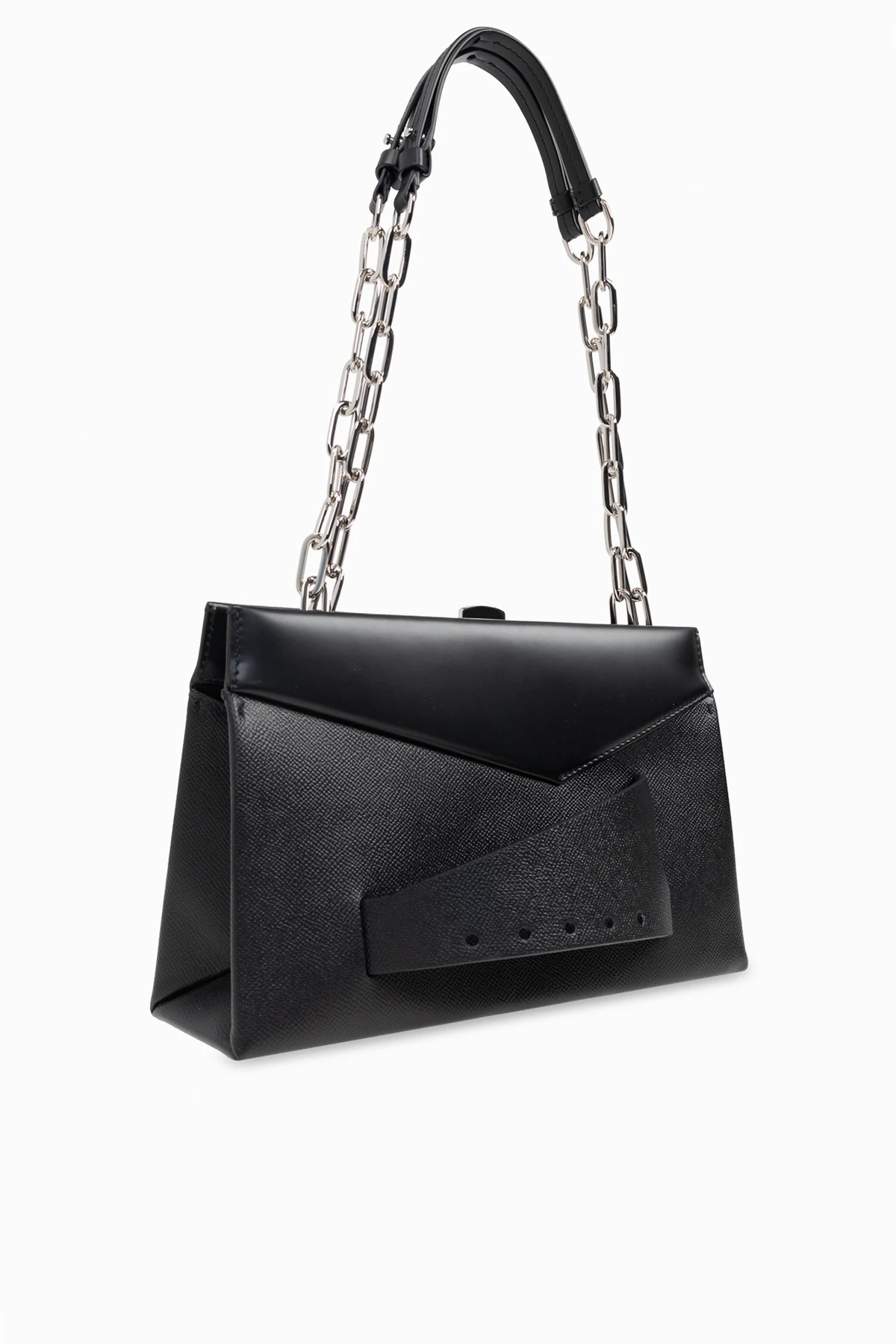 Introducing the Snatched Medium, an epitome of sophistication and modernity from the illustrious house of Maison Margiela. This rectangular shoulder bag, crafted with impeccable precision, exudes elegance with its sharp edges and asymmetrical front flap, rendering it a contemporary masterpiece. Fashioned from the finest black leather, the bag boasts a textured front that enhances its elegant allure. The striking silver chain strap provides a bold contrast against the bag\'s delicate form, offering a harmonious blend of strength and grace. Adorning the front is a distinctive buckle-like embellishment, adding a touch of sophistication. The meticulously crafted interior includes a zippered pocket and a slip pocket, ensuring practicality without compromising style. Why Choose This Product? Exquisite design by Maison Margiela, renowned for redefining fashion norms. Premium quality 100% leather material. Timeless black color, perfect for any formal or semi-formal occasion. Secure snap closure with organized interior compartments.
