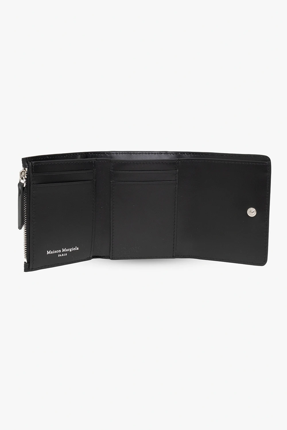 Black folding wallet from Maison Margiela. Crafted from leather, this design fastens with snaps and showcases a signature white logo on the front, a back card slot and one bill compartment, one zip coin pocket, two slip pockets and four card slots inside.