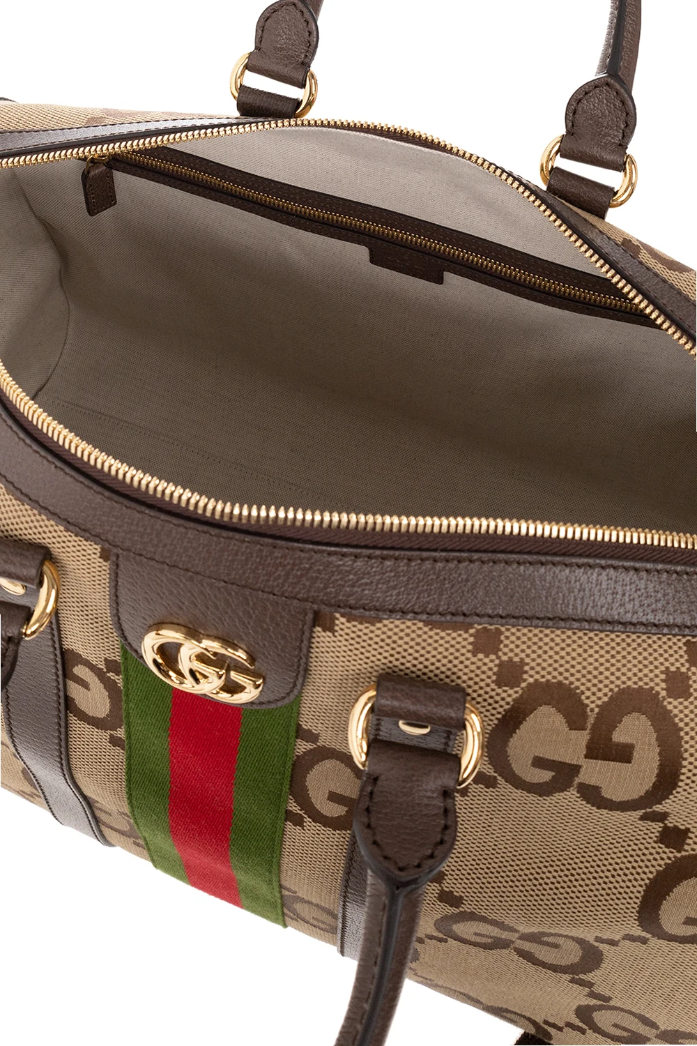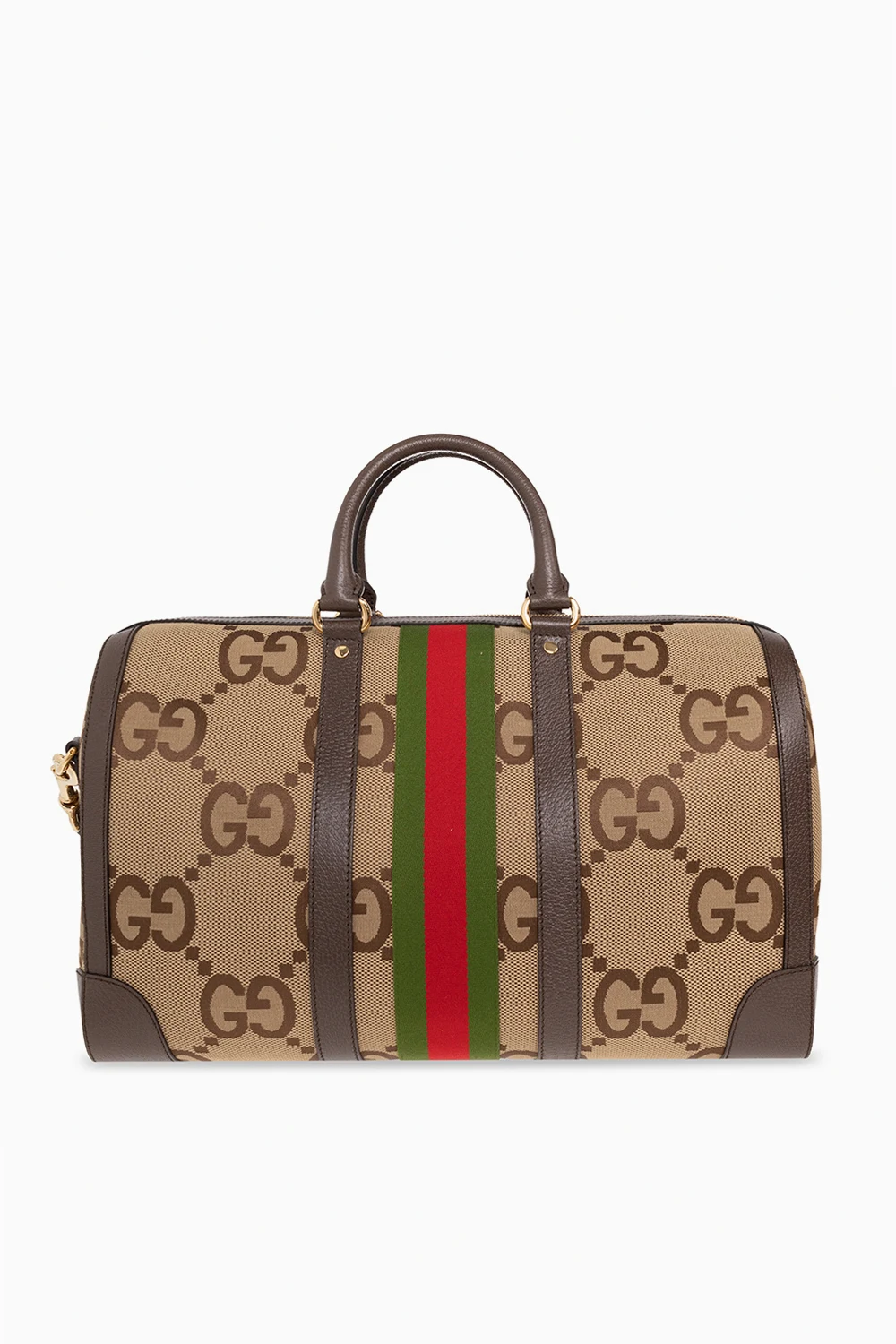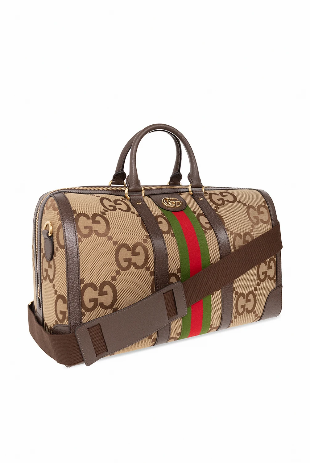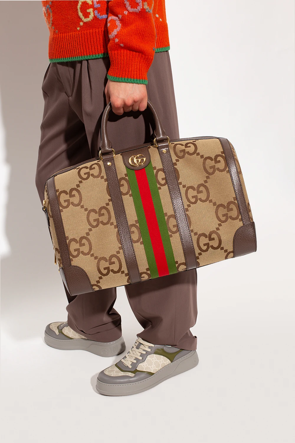 Beige and brown ‘Ophidia Medium’ duffel bag from Gucci. Crafted from GG Originals canvas and trimmed with calf leather, this design secures with a two-way zip and features logo hardware and the brand\'s signature green and red Web stripe detailing, two half-round handles, a detachable and adjustable shoulder strap, gold-tone metal elements and one internal compartment with a zip pocket.