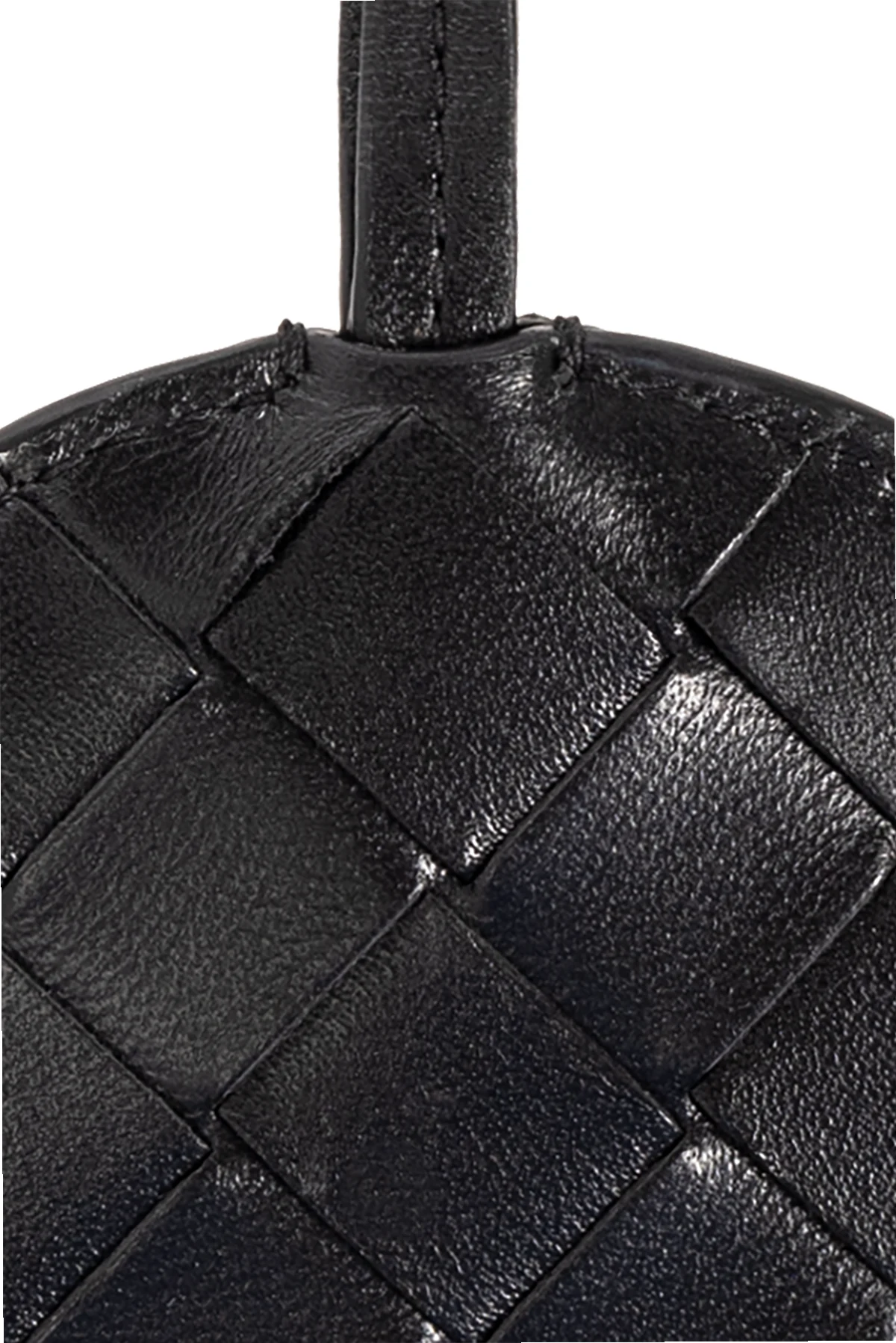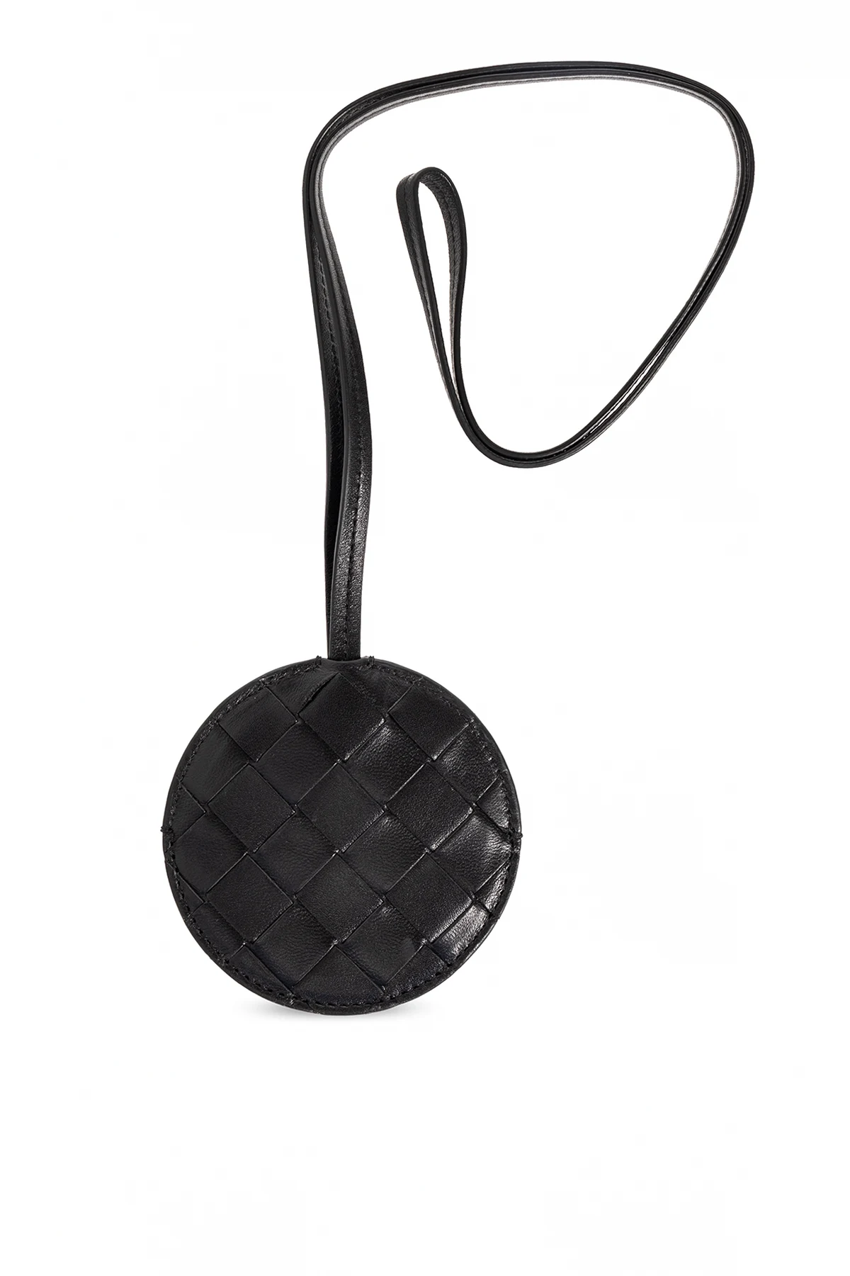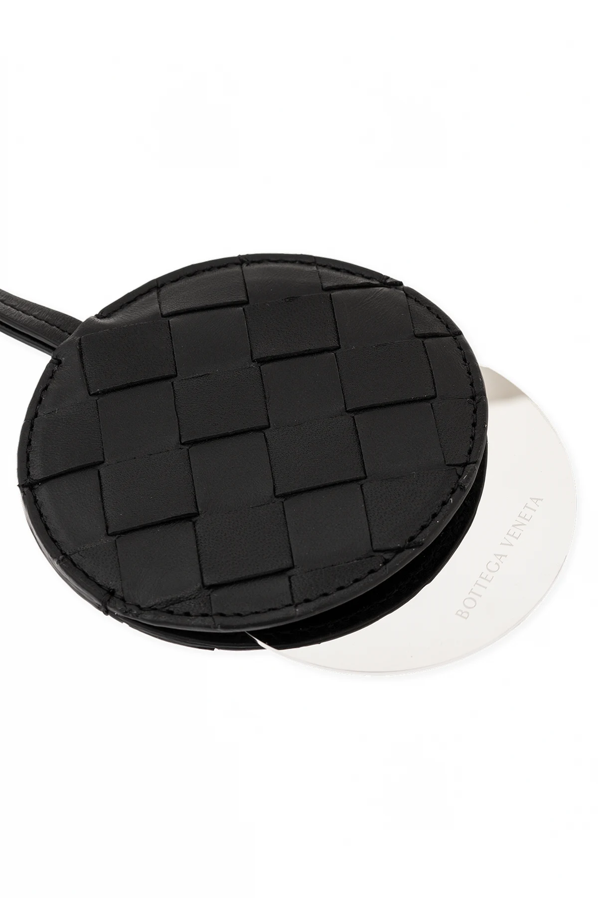 Round mirror on a strap with an Intrecciato lamb leather case in black from Bottega Veneta.