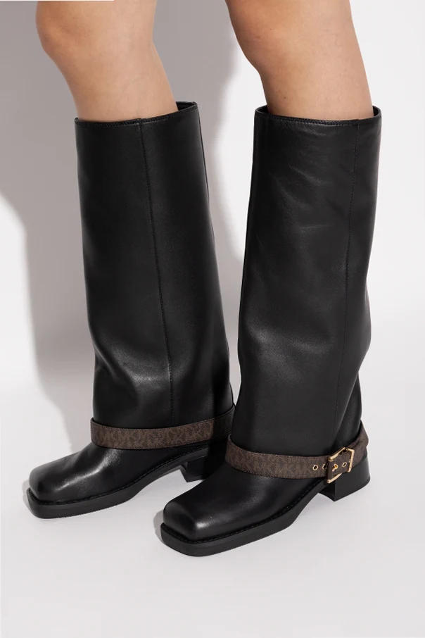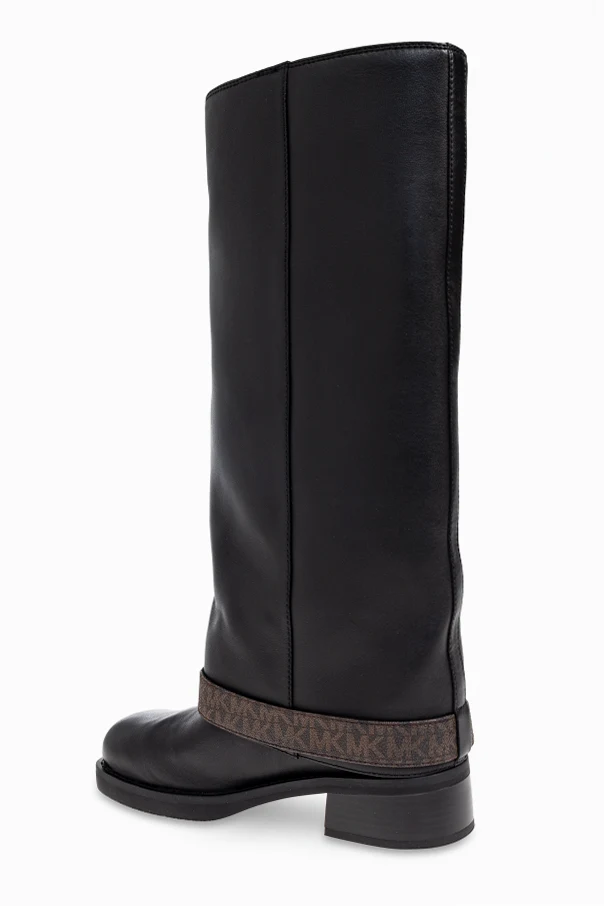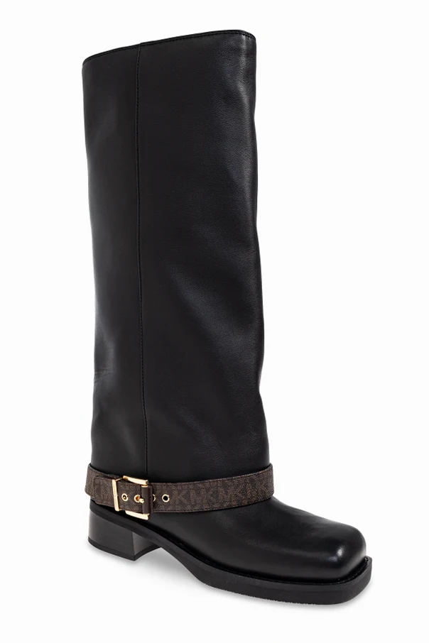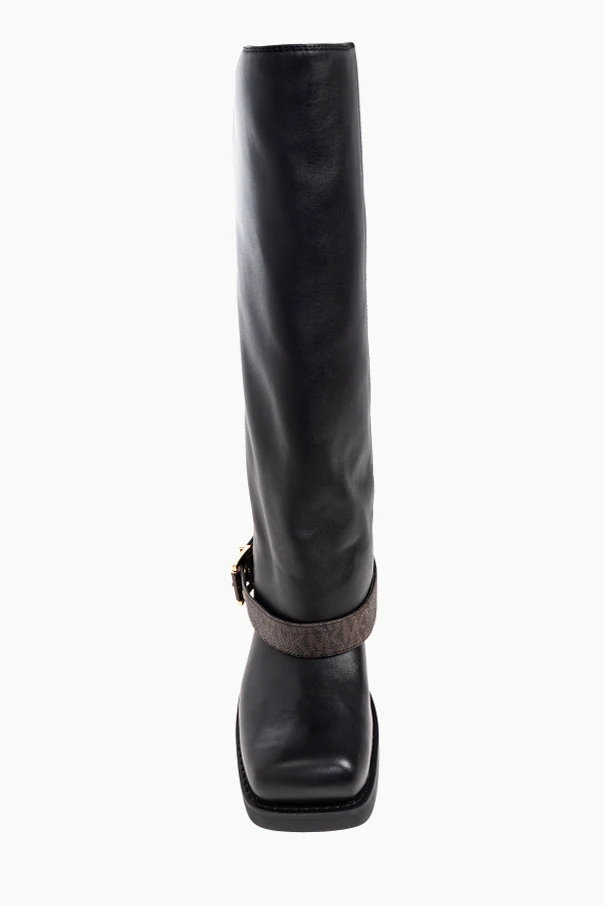 Discover an embodiment of urban elegance with the Colby Knee-High Boots by MICHAEL Michael Kors . These black boots captivate with a minimalist silhouette—featuring a sleek, unembellished shaft and a sculpted, square toe for a contemporary flair. The signature ankle strap, adorned with the iconic designer monogram in rich brown tones and delicate gold-tone hardware, adds a subtle yet distinctive touch of sophistication.