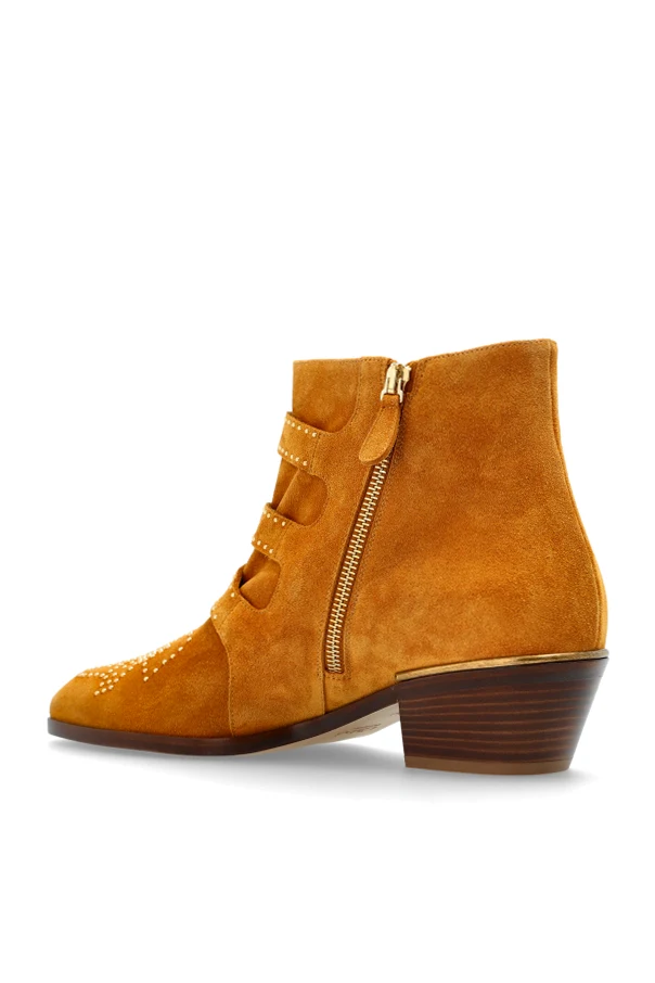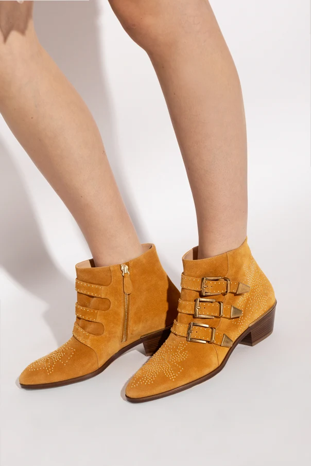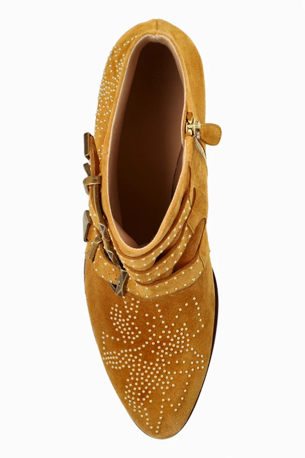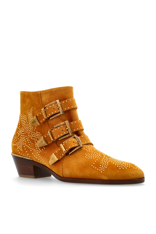 Elevate your style with the Susan Suede Ankle Boots by Chloé —a masterful embodiment of contemporary elegance and refined craftsmanship. Rendered in sumptuous, premium suede, these ankle boots feature a graceful almond-shaped toe and a stable mid-height block heel reminiscent of polished wood. The exterior is adorned with three striking gold-toned buckles, accentuated by intricate, botanical or star-shaped metallic studs that glimmer across the supple upper.
