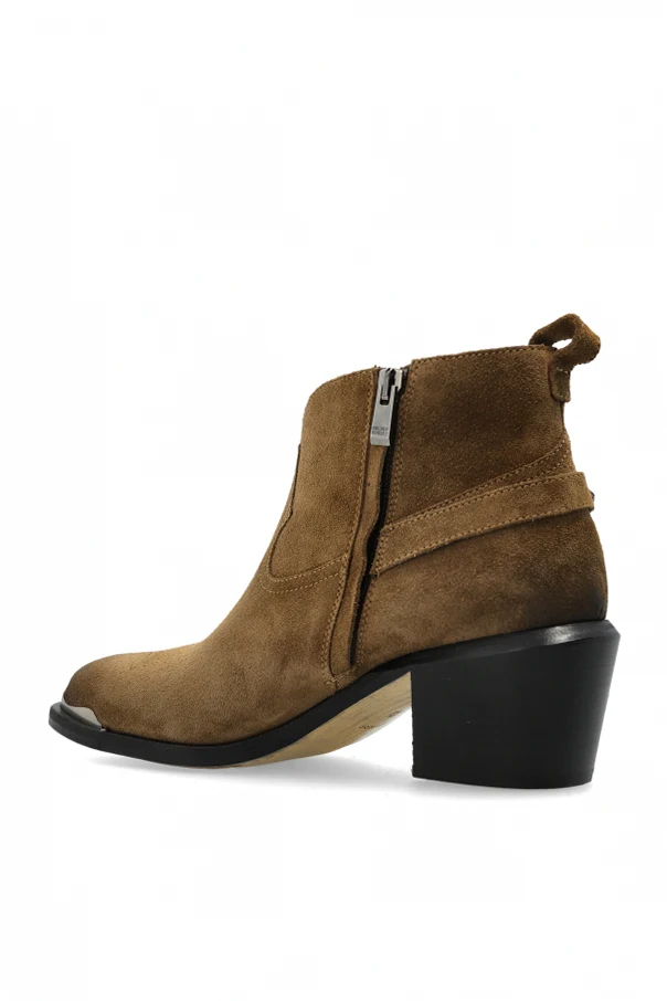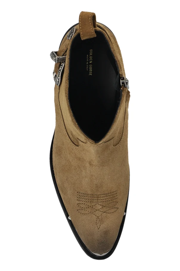 Discover refined sophistication with the ‘Patty’ Leather Ankle Boots by Golden Goose. Crafted from sumptuous brown suede leather, these ankle boots embody understated elegance and a distinct Western allure. The sleek, tapered toe and robust mid-height block heel evoke classic sensibilities, while the smooth suede finish is beautifully accented by decorative stitching, evoking timeless cowboy-inspired charm.